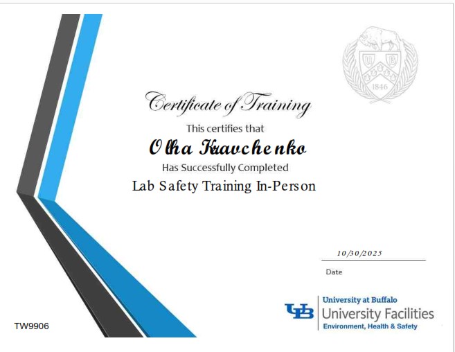 У межах стажування я також пройшла курс Laboratory Safety, успішно склала фінальний іспит і отримала відповідний сертифікат, що забезпечив доступ до повноцінної роботи у лабораторіях університету. Особливе значення для мене мав університетський семінар, на якому я виступила з доповіддю щодо екологічних наслідків воєнних дій та загроз для водних систем України.