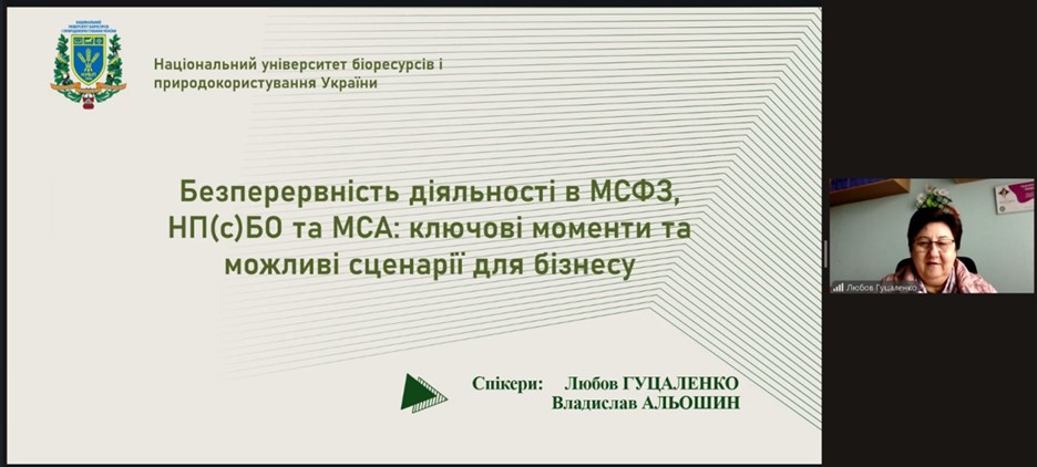 Професор кафедри обліку та оподаткування НУБіП України, доктор економічних наук Любов ГУЦАЛЕНКО та заступник генерального директора з МСФЗ ТОВ «ЕЙЧ ЕЛ БІ Юкрейн» Владислав АЛЬОШИН зосередили увагу на концепції безперервності діяльності в МСФЗ, НП(С)БО та МСА. У своїй доповіді вони акцентували увагу на необхідності адаптації облікової політики до мінливого середовища та підвищення ролі професійного судження бухгалтера.