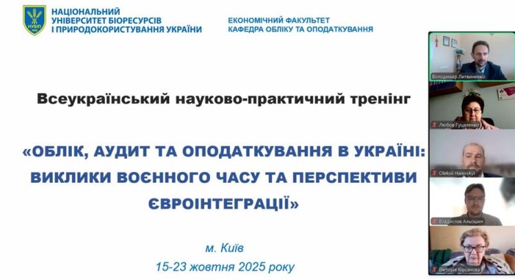 З 15 по 23 жовтня 2025 року кафедра обліку та оподаткування економічного факультету Національного університету біоресурсів і природокористування України провела Всеукраїнський науково-практичний тренінг «Облік, аудит та оподаткування в Україні: виклики воєнного часу та перспективи євроінтеграції». Захід об’єднав викладачів, здобувачів PhD, представників бізнесу, аудиторських компаній та фінансових структур задля професійного обговорення актуальних проблем і тенденцій розвитку бухгалтерського обліку, аудиту й оподаткування в сучасних умовах.