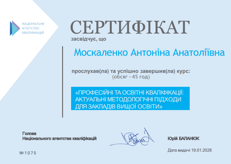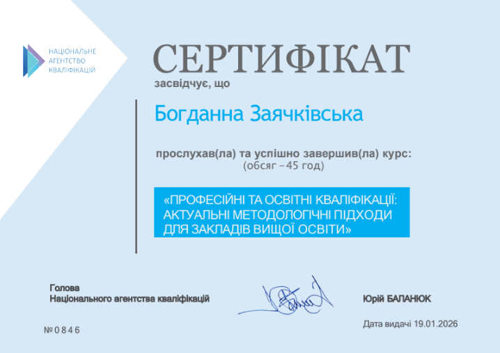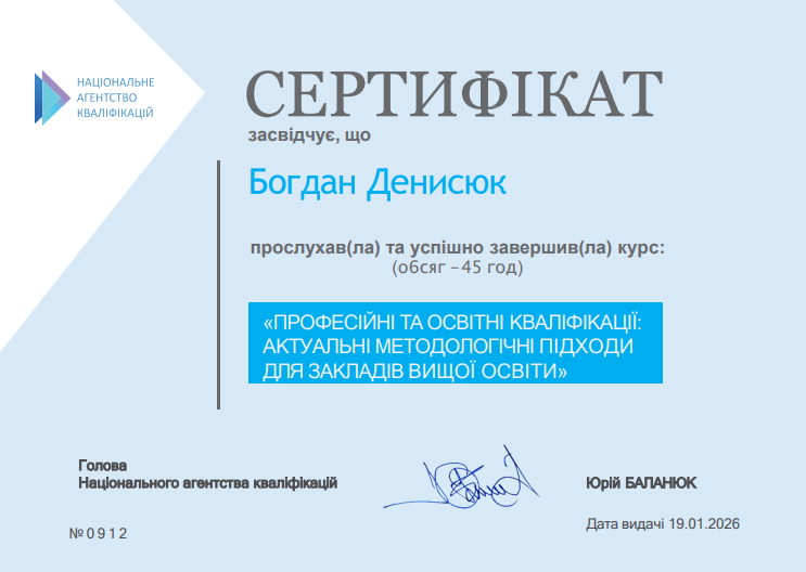 В переод з 03 грудня 2025 року по 13.01.2026 року завідувач кафедри геоінформатики і аерокосмічних досліджень Землі, к.т.н., доцент Антоніна МОСКАЛЕНКО, д.е.н., доцент Анатолій ПОЛТАВЕЦЬ, к.е.н., старший викладач Богданна ЗАЯЧКІВСЬКА та старший викладач Богдан ДЕНИСЮК прослухали другий курс відеолекцій «ПРОФЕСІЙНІ TА ОСBІTНІ КBАЛІФІКАЦІЇ: АКTУАЛЬНІ МЕTОДОЛОГІЧНІ ПІДХОДИ ДЛЯ ЗАКЛАДІB BИЩОЇ ОСBІTИ» обсягом 45 год, організований Національним агенством кваліфікацій, успішно склали підсумкове тестування та отримали відповідні сертифікати.