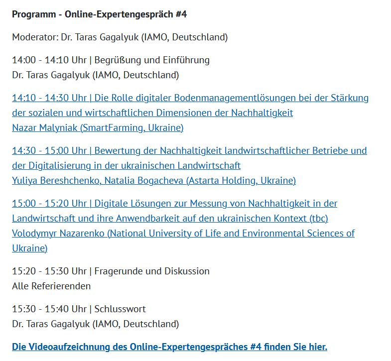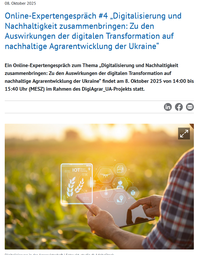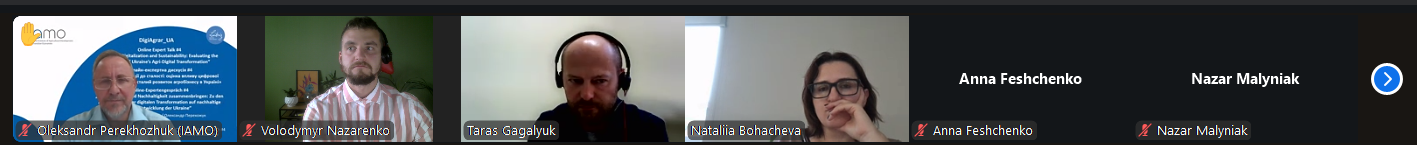 08 жовтня у рамках участі у проекті «Digital Transformation for Sustainable Development: German-Ukrainian Perspectives for Future Agricultural and Food Systems in Europe» (DigiAgrar_UA) (Цифрова трансформація для сталого розвитку: німецько-українські перспективи майбутніх аграрних та продовольчих систем у Європі відбувся четвертий заключний захід із серії бесід експертів DigiAgrar_UA, організованої Лейбніцським інститутом аграрного розвитку в умовах перехідної економіки (IAMO) у співпраці з Українським клубом аграрного бізнесу (УКАБ), Національним університетом біоресурсів і природокористування України (НУБіП України) та Поліським національним університетом.