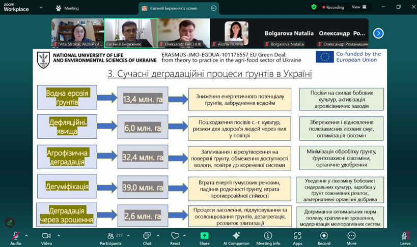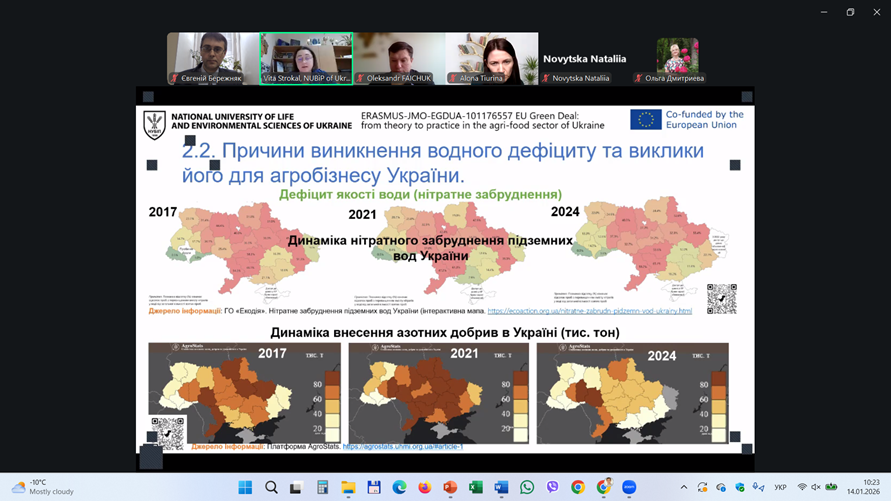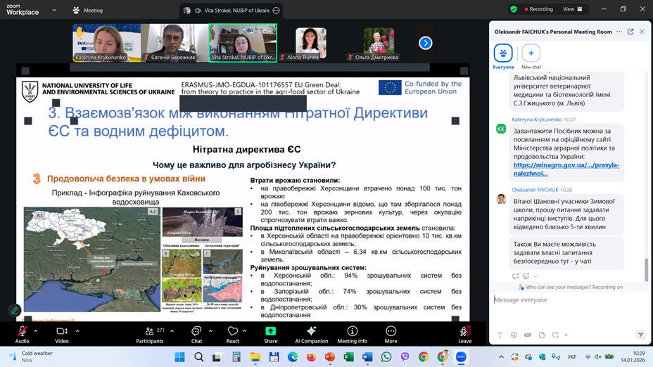 У якості запрошених викладачів-спікерів були також і доценти кафедри екології агросфери та екологічного контролю Віта СТРОКАЛЬ і Євгеній БЕРЕЖНЯК. Так, 14 січня 2026 р. першою із доповіддю на тему «Виклики водного дефіциту для агробізнесу» виступила Віта СТРОКАЛЬ, у якій розкрила гострі питання, які пов’язані із якістю поверхневих вод, причинами виникнення водного дефіциту та викликами його для агробізнесу України. Спікерка також ознайомила присутніх колег і з питаннями взаємозв’язків між виконанням Нітратної Директиви Європейського Союзу та водним дефіцитом. Цікаво було почути і про нові підходи інтеграції щодо ресурсо-ефективного сільського господарства із врахуванням вимог Нітратної Директиви. Наприкінці свого виступу Віта СТРОКАЛЬ презентувала приклади власних досліджень щодо вимірювань водного дефіциту для потреб зрошення, базуючись на зібраних даних по Київському водосховищу.
