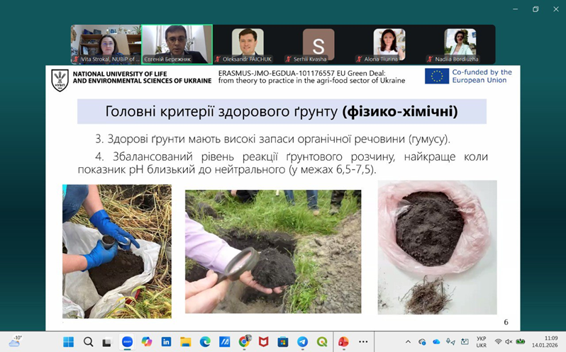 У рамках реалізації проєкту ERASMUS + Jean Monnet Modules «European Green Deal: від теорії до практики в агропродовольчому секторі України» 101176557 – EGDUA –ERASMUS-JMO-2024-HEI-TCH-RSCH на базі кафедри адміністративного менеджменту та зовнішньоекономічної діяльності НУБіП України було проведено міжнародну зимову школу «Виклики для агропродовольчого сектору України в рамках реалізації Європейського зеленого курсу», яка тривала із 12 січня по 6 лютого 2026 року. Мета зимової школи полягала у підвищенні обізнаності викладачів університету та інших навчальних закладів, представників виробничої аграрної сфери, громадських активістів і діячів для отримання сучасних знань щодо європейської інтеграції та суспільної підтримки доктрини Європейського зеленого курсу.