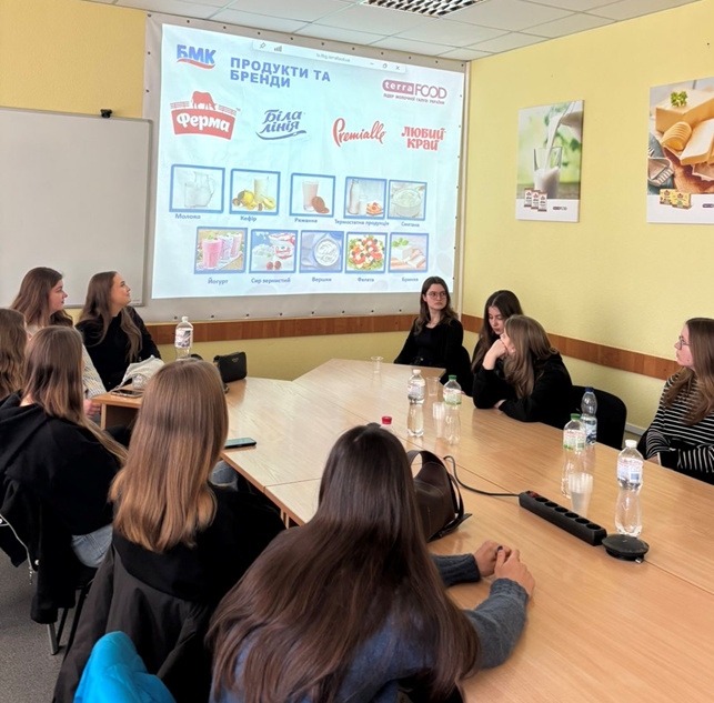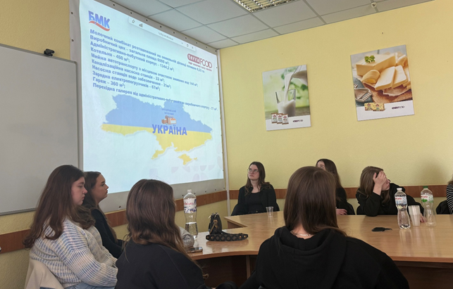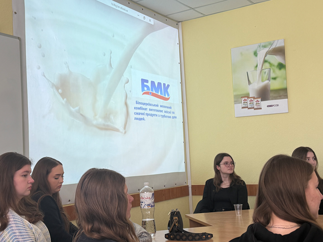 Розпочалося насичене практичне заняття-екскурсія з презентації про діяльність Білоцерківського молочного комбінату. Студенти дізналися, що філія «Білоцерківський молочний комбінат» (БМК) Компанії «ТЕРРА ФУД» – один із найсучасніших у Східній Європі та перший в Україні завод із випуску продукції з незбираного молока, що відповідає нормам Міжнародної молочної федерації та директивам Європейського Союзу.