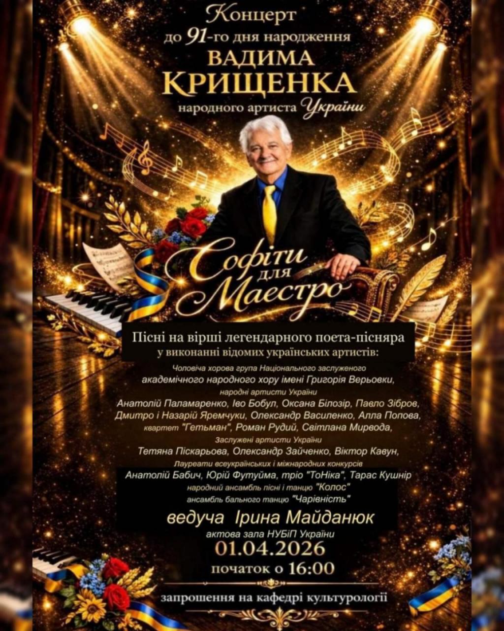 01 квітня у більшості людей асоціюється із Днем сміху, або ж — Днем дурня, або Міжнародним днем веселощів на роботі. А от в Національному університеті біоресурсів і природокористування України уже багато років поспіль цей день знають як день народження народного артиста України, заслуженого працівника культури, заслуженого діяча мистецтв України, члена Національної Спілки письменників України, лауреата багатьох літературно-мистецьких премій, кавалера і повного кавалера державних нагород і найвищих нагород Української православної церкви, найвищих відзнак громадських організацій професора кафедри культурології Вадима Дмитровича КРИЩЕНКА. Знають — і щороку чекають, яка ж мистецька подія відбуватиметься на сцені університету.