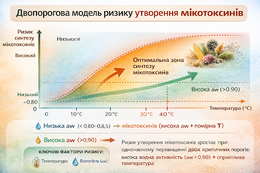 Дослідниками розроблена двопорогова модель ризику утворення мікотоксинів, яка пояснює синтез цих токсичних метаболітів як процес, що визначається двома ключовими факторами середовища: водною активністю (aw) та температурою. Ріст грибів і продукція токсинів майже не відбуваються при aw менше 0,80, тоді як при значеннях від 0,85 до 0,90 можливе обмежене розмноження грибів. Активний синтез мікотоксинів спостерігається при aw, що перевищує 0,90.