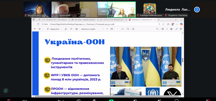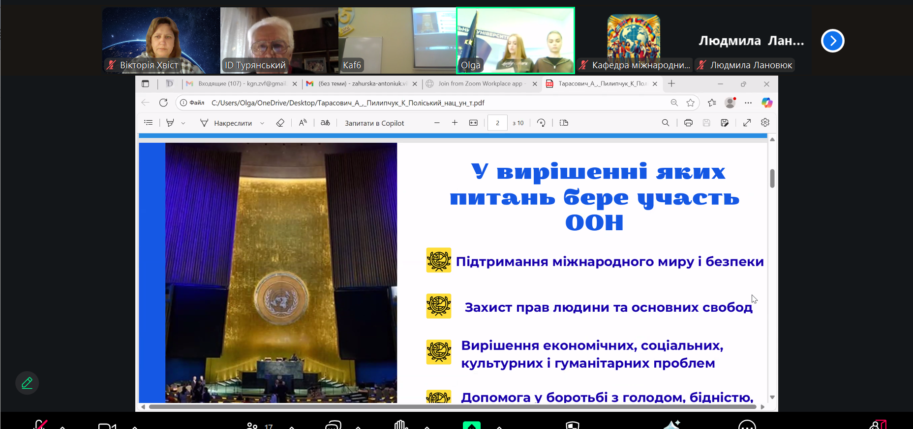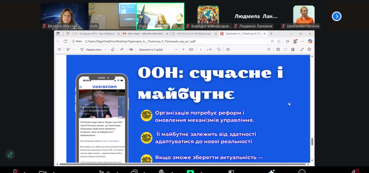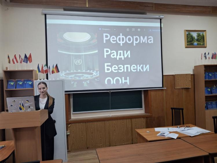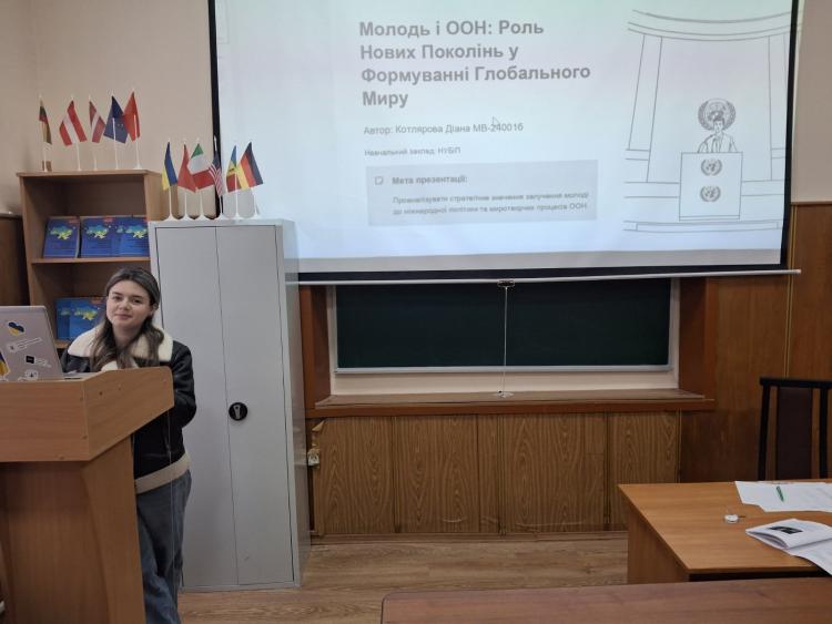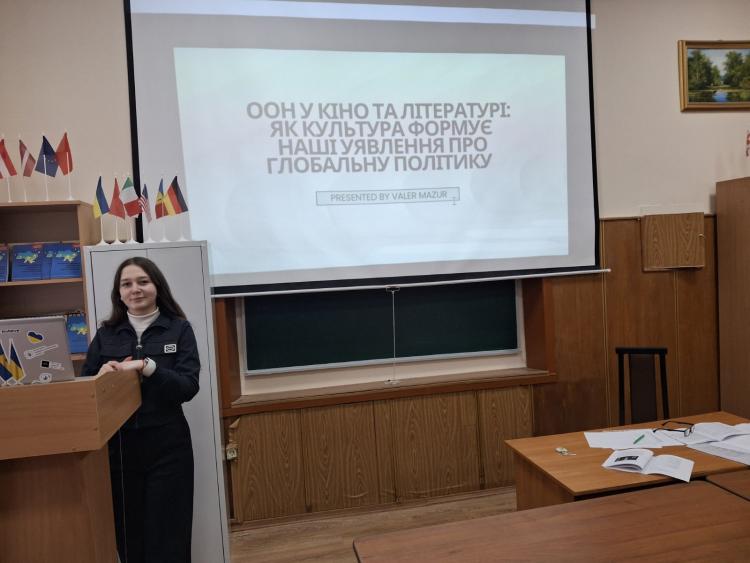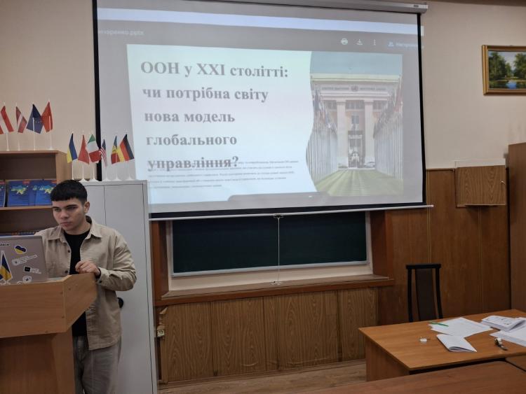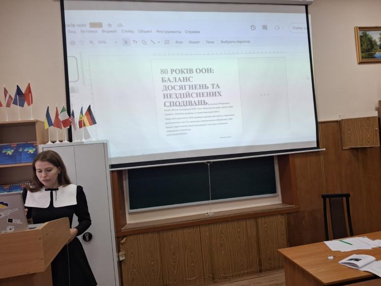 - бакалавриня І курсу навчання Аліна Тарасович та Катерина Пилипчук доповіддю «ООН: символ надії чи розчарування?» та