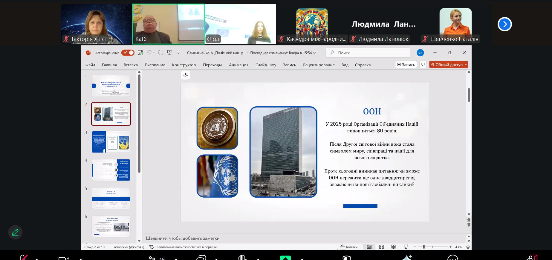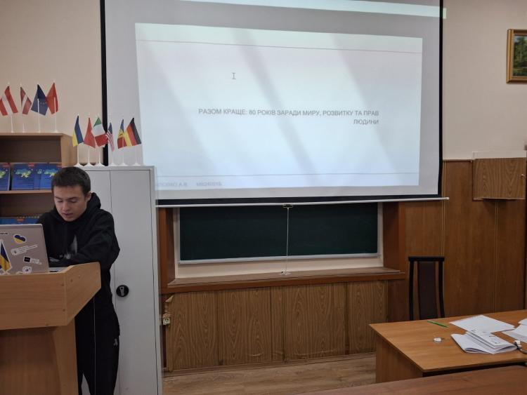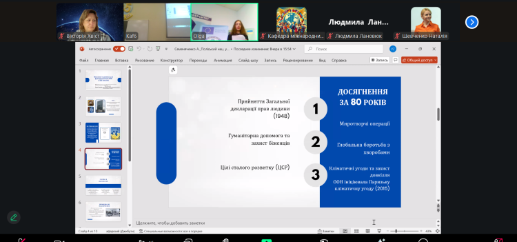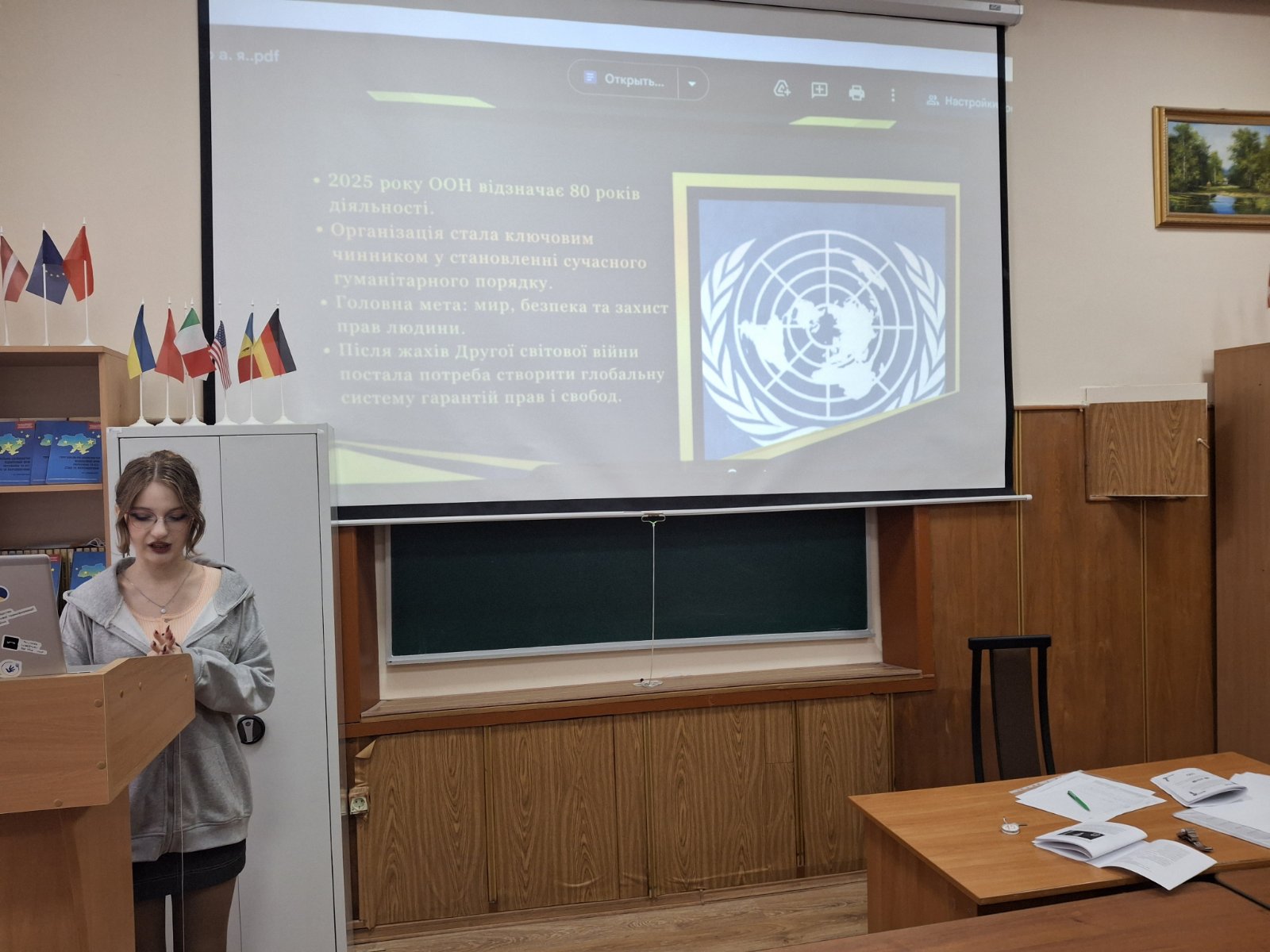 Напередодні цієї дати актив науково-навчальних гуртків кафедри міжнародних відносин і суспільних наук «Інформація і політика» та «Дипломатія і геополітика» разом із колективом кафедри організував Всеукраїнський науково-практичний вебінар студентства та наукової молоді «ООН – 80: здобутки, прорахунки, перспективи», щоб ще раз проаналізувати попередні підсумки багаторічної діяльності цієї універсальної міжнародної організації, її роль у сьогодняшньому глобалізованному світі.