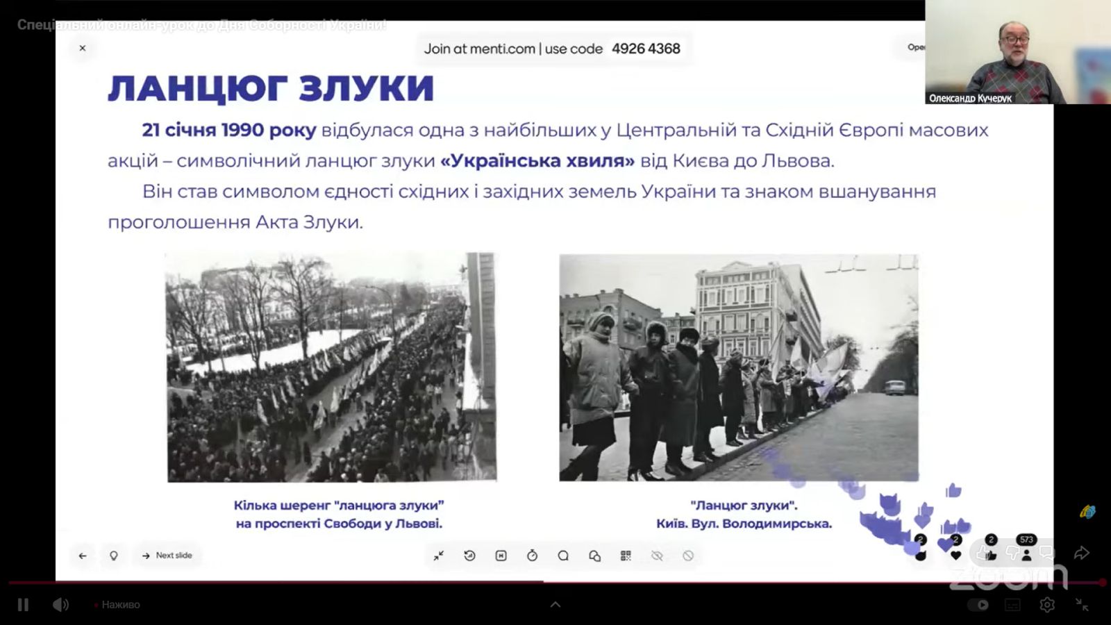 Учасників заходу привітав з Днем Соборності голова Верховної Ради України Руслан Стефанчук. Олександр Кучерук – історик, завідувач відділу Національного музею історії України прочитав міні-лекцію. Ольга Сухова провела вікторину для учасників заходу.