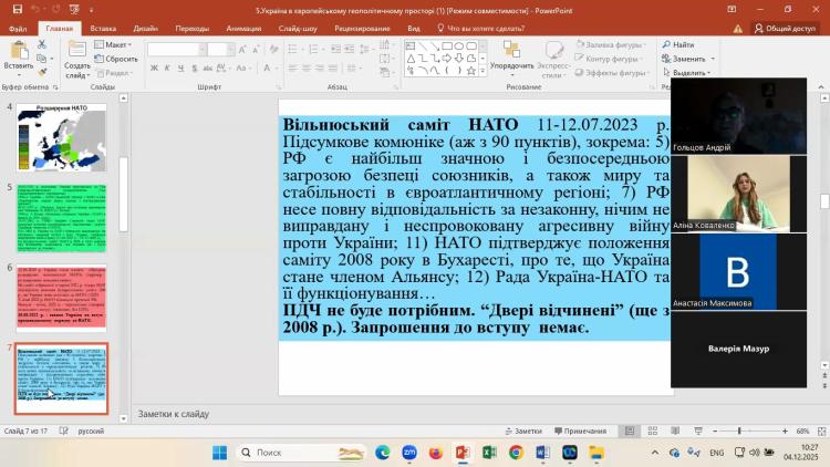4 грудня 2025 року відбулося засідання студентського наукового гуртка «Актуальні проблеми міжнародних відносин» на тему «Сучасний розвиток НАТО, проблеми та перспективи вступу України до Альянсу. Утворення та розвиток Європейського Союзу». Як продовження тематики попереднього засідання, обговорювалися ще два питання. У своїх виступах Дарина РЕВЕНКО та Валерія МАЗУР розглянули основні етапи виникнення та розвитку відносин між Україною й НАТО. Крім позитивного досвіду взаємовідносин між Україною та Альянсом, було наголошено на низці проблемних моментів, наприклад під час президентства В. Януковича ці відносини фактично зазнали «заморожування». Після Революції гідності в 2014 р. відносини між Україною й НАТО суттєво активізувалися.