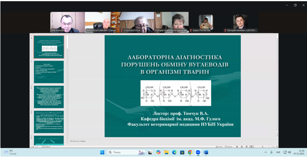 Завідувач кафедри, доктор ветеринарних наук, професор Віктор Томчук прочитав лекцію згідно робочої програми дисципліни на актуальну тему «Лабораторна діагностика порушень обміну вуглеводів в організмі тварин». Захід був проведений у дистанційному форматі на платформі Zoom, забезпечивши доступність та інтерактивність для всіх учасників.