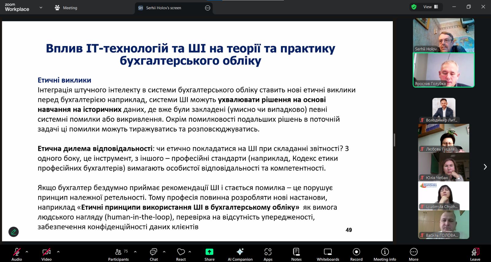 Під час лекції-презентації співавтор Ярослав ГОЛУБКА (є практикуючим аудитором, сертифікованим бухгалтером-практиком (CAP)), акцентував увагу на ролі сучасних технологій та етичних викликах у бухгалтерському обліку. Було зазначено, що сьогодні облік дедалі тісніше інтегрується зі штучним інтелектом, базами даних та аналітичними платформами, що, своєю чергою, порушує важливе питання – етичної відповідальності бухгалтера за рішення, ухвалені за участю сучасних технологій. Як підкреслювали учасники під час дискусійних обговорень, з одного боку, сучасні технології підвищують ефективність праці, але з іншого – вимагають нової культури етики, професійної автономії та необхідності перевіряти, аналізувати й нести відповідальність за отримані результати.