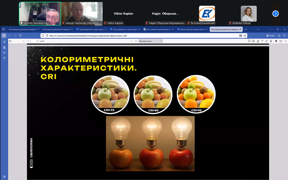 У своєму виступі спікер окреслив еволюцію світлотехніки від ламп розжарювання до сучасних світлодіодних технологій, акцентувавши увагу на їхній енергоефективності, довговічності та технологічних перевагах. Особливу увагу було приділено фізичним характеристикам світла, індексу передачі кольору (CRI), колірній температурі та впливу освітлення на здоров’я і продуктивність людини.