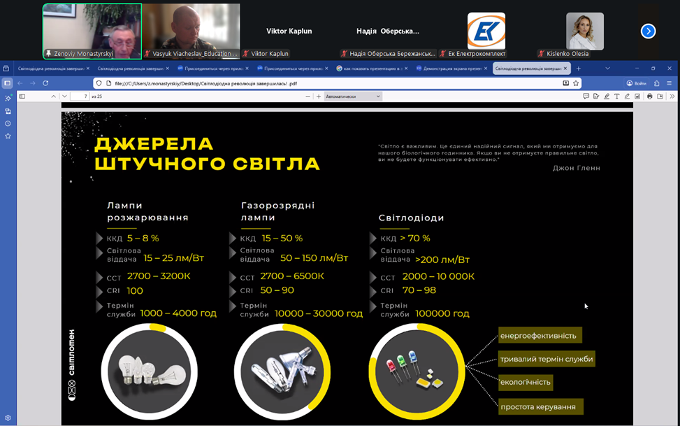 У межах акселератора відбувся вебінар «Сучасні тренди світлодіодної революції». Спікером заходу виступив Зеновій МОНАСТИРСЬКИЙ доктор технічних наук, фундатор та голова ради директорів групи компаній «СВІТЛОТЕК», один із провідних фахівців у сфері світлотехніки та енергоефективного освітлення.