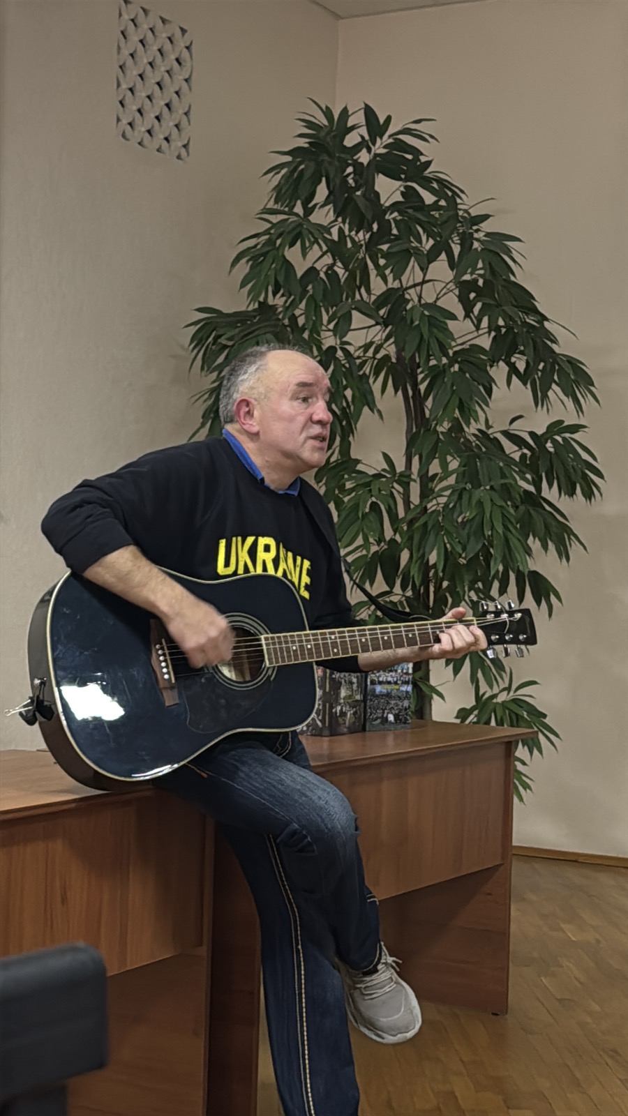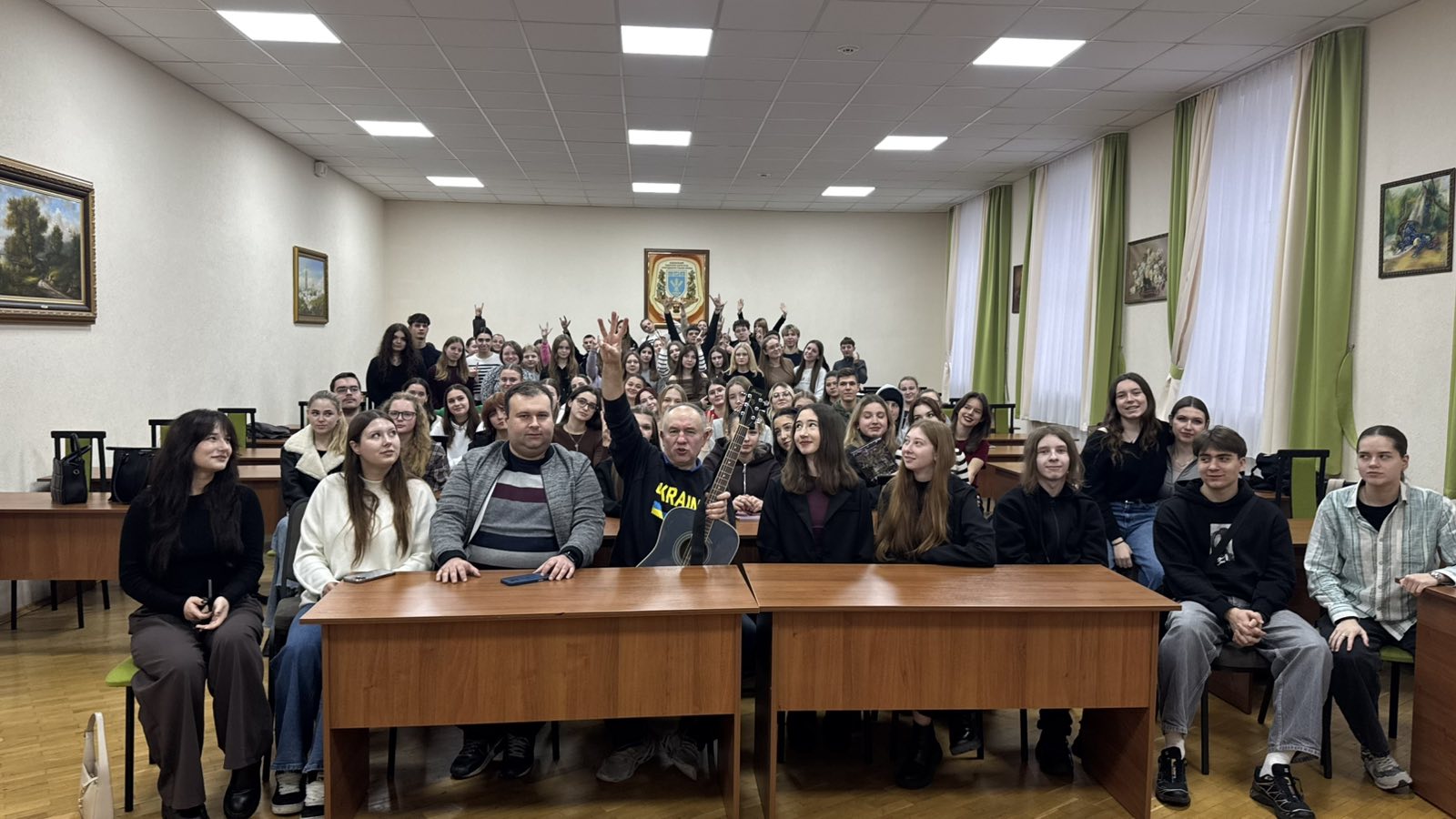 Під кінець зустрічі Володимир Васильович знову взяв до рук гітару і вся авдиторія заспівала нашу рідну «Червону руту», коли ми виконували пісню у кімнаті відчувалось сімейне тепло та затишок, ми були об’єднані піснею, а саме такі люди як пан Володимир є рушійною силою цього об’єднання. Варто зазначити, що студентам випала можливість почути його авторську пісню «І все ж, люби життя!», не було жодного студента кого б вона не торкалась, вона про прийняття того, що маєш, про те, що варто радіти просто тому, що живеш.
