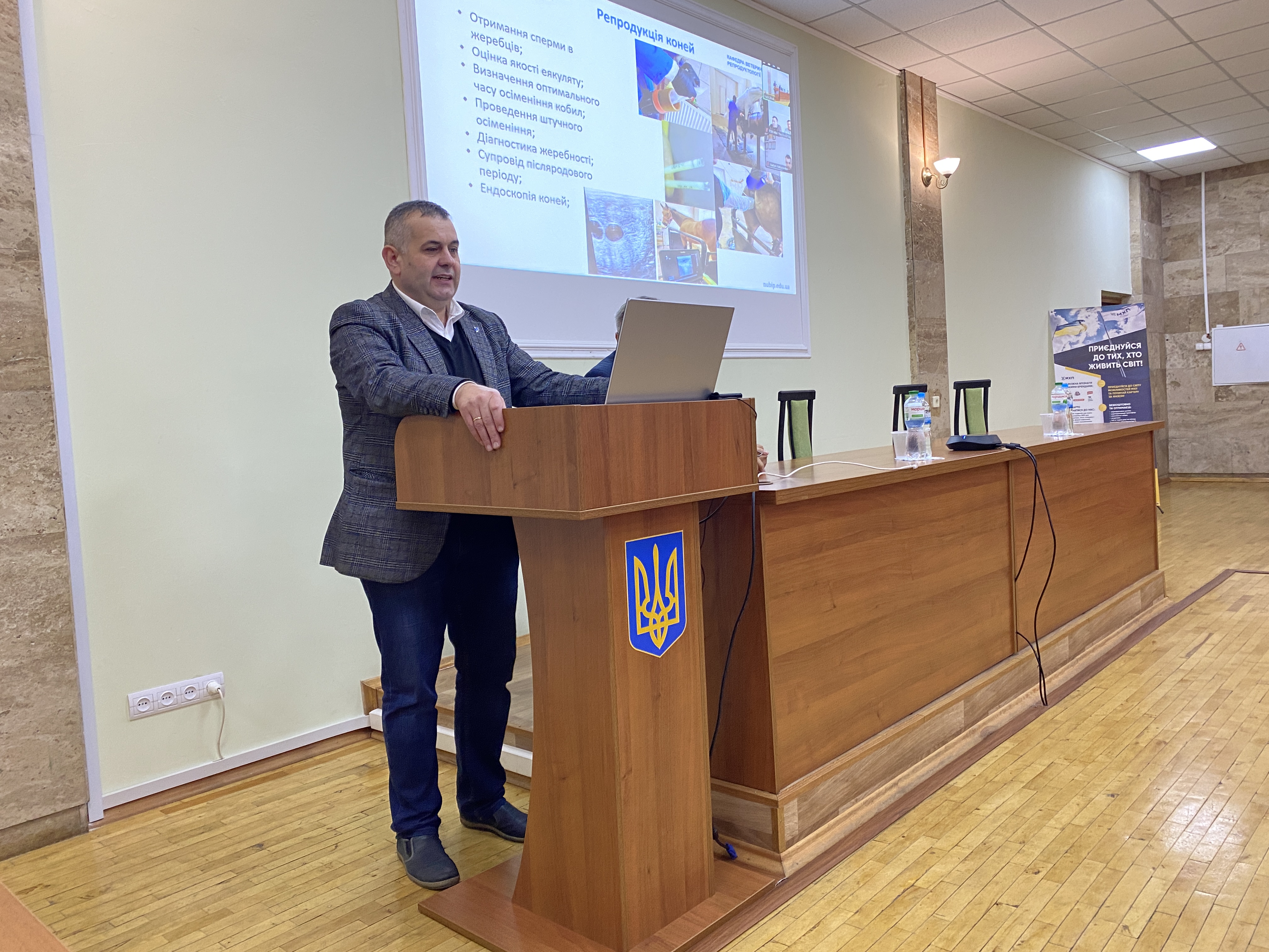 Кафедру ветеринарної репродуктології у короткій, але змістовній презентації представив в.о. завідувача, доцент Сергій ДЕРКАЧ. Він підкреслив високий науковий та практичний потенціал кафедри, яка має багаторічний досвід і унікальні компетенції у сфері контролю відтворення продуктивних і дрібних домашніх тварин. Також він акцентував, що колектив кафедри не лише забезпечує якісну підготовку здобувачів освіти, а й активно впроваджує сучасні біотехнологічні методи у ветеринарну практику, роблячи свій внесок у розвиток галузі та підвищення ефективності тваринництва в Україні.
