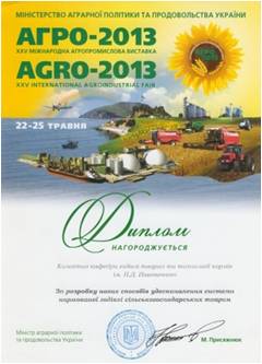 Колектив кафедри нагороджено дипломом ХХV Міжнародної агропромислової виставки «Агро–2013» за розробку нових способів удосконалення системи нормованої годівлі тварин.