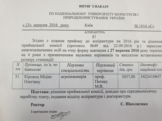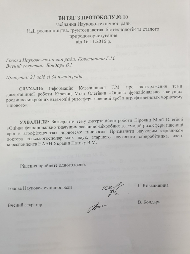 3 | Кіроянц Мідія Олегівна | денна форма навчання / 27.09.2016-27.09.2020 | «Оцінка функціонально-значущих рослинно-мікробних взаємодій ризосфери ячменю ярого в агроценозах чорнозему типового» – атестація за 1 рік, 2 рік (1, 2), 3 рік (1), 4 рік (1) | д.с.-г.н. Патика М.В. |