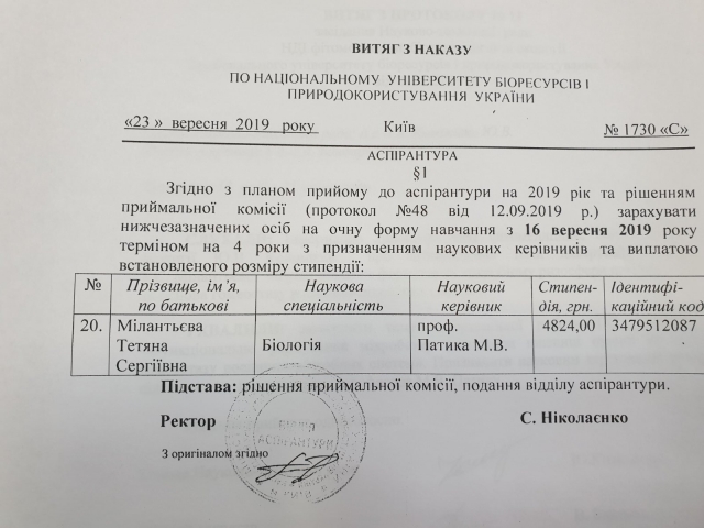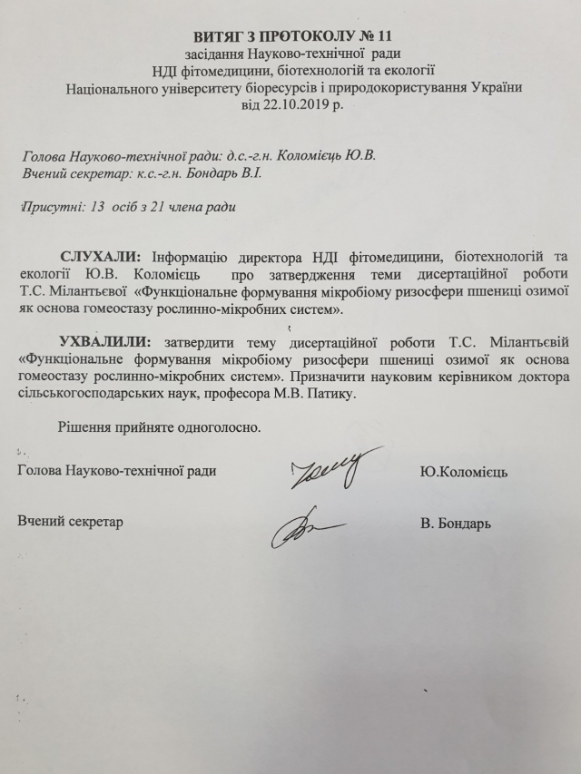 1 | Мілантьєва Тетяна Сергіївна | денна форма навчання / 16.09.2019-16.09.2023 | «Функціональне формування мікробіому ризосфери пшениці озимої як основа гомеостазу рослинно-мікробних систем» | д.с.-г.н. Патика М.В. |