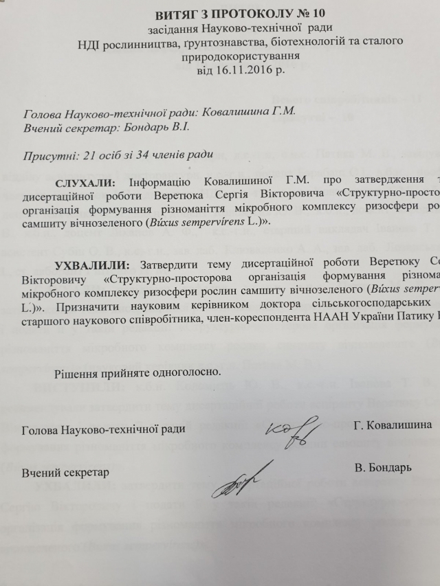 4 | Веретюк Сергій Вікторович | денна форма навчання / 27.09.2016-27.09.2020 | «Структурно-просторова організація формування різноманіття мікробного комплексу ризосфери рослин самшиту вічнозеленого (Búxus sempervirens)» - атестація за 1 рік, 2 рік (1, 2), 3 рік (1, 2), 4 рік (1) | д.с.-г.н. Патика М.В. |