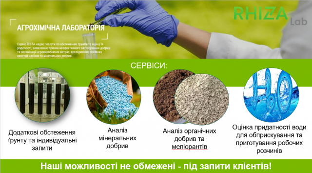 Робота лабораторії спрямована на моніторинг якості ґрунтів й дослідження у виробничників проблемних ділянок на полях для підвищення ефективності використання потенціалу поля та збереження рівня його родючості. В залежності від потреб замовника результати аналізів можуть бути у вигляді таблиць з даними, аналіз з рекомендаціями, графіками, картами, картами-завданнями для диференційного внесення добрив, які надають спеціалісти.