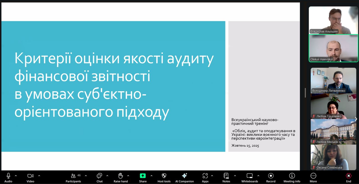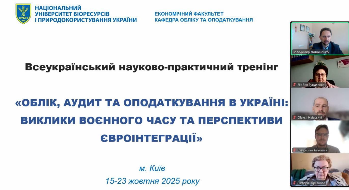 15 жовтня 2025 року на кафедрі обліку та оподаткування економічного факультету НУБіП України в онлайн-форматі (платформа Zoom) відбувся Всеукраїнський науково-практичний тренінг «Облік, аудит та оподаткування в Україні: виклики воєнного часу та перспективи євроінтеграції». Захід організовано з метою обміну науковим і практичним досвідом, обговорення актуальних питань фінансової звітності та підвищення якості аудиторського контролю в умовах сучасних ризиків.