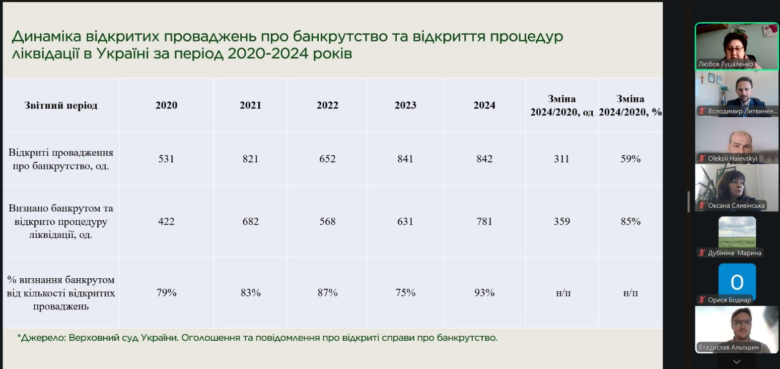 У межах цієї доповіді була представлена аналітична таблиця, що ілюструє динаміку відкритих проваджень про банкрутство та процедури ліквідації підприємств в Україні у період 2020–2024 років.