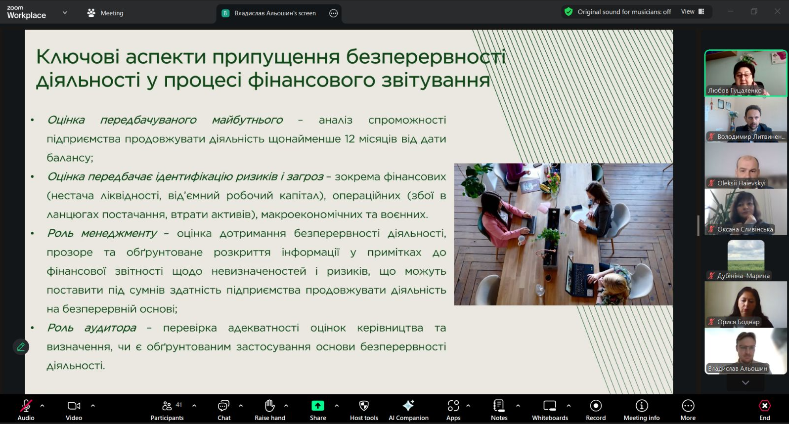 Першим лектором виступила д.е.н. Любов ГУЦАЛЕНКО з доповіддю «Безперервність діяльності в МСФЗ, НП(с)БО та МСА: ключові моменти та можливі сценарії для бізнесу». У виступі було окреслено: