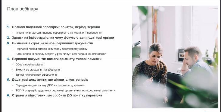 Даний захід був присвячений важливим питанням, наприклад, як проходять планові податкові перевірки, їх етапи, терміни та основні вимоги; що саме запитують контролюючі органи та на що звертають увагу, форми запиту та його наповнення; які облікові дані потрібні будуть інспекторам; що потрібно знати про особливості визнання витрат на основі первинних документів; порядок визнання витрат у податковому обліку; вимоги до змісту первинних документів та типові помилки в них; передумови для запиту Державної податкової служби на додаткові документи і які саме додаткові документи цікавлять контролерів; що потрібно зробити до початку перевірки.