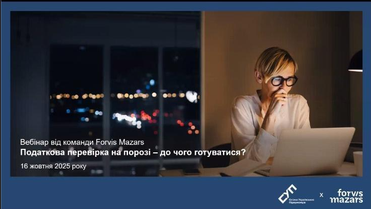 16 жовтня 2025 року відбувся Вебінар «Податкова перевірка на порозі – до чого готуватися», проведений фахівцями Forvis Mazars та Спілки Українських Підприємців (СУП), для слухачів, які бажають дізнатися, як підготуватися до податкових перевірок та уникнути зайвих ризиків для бізнесу.