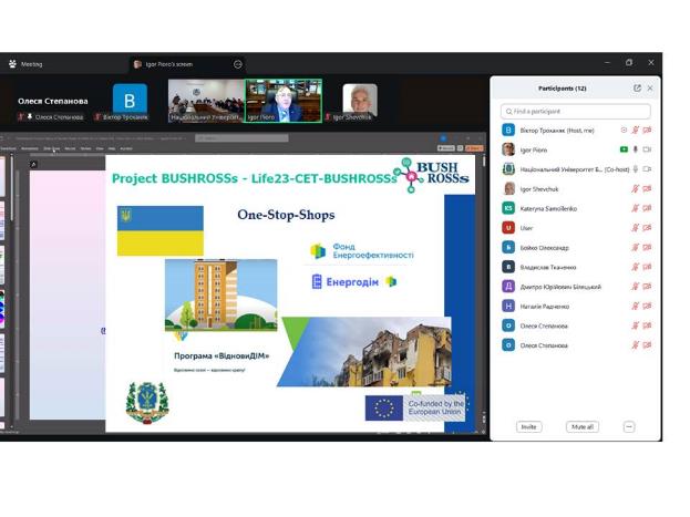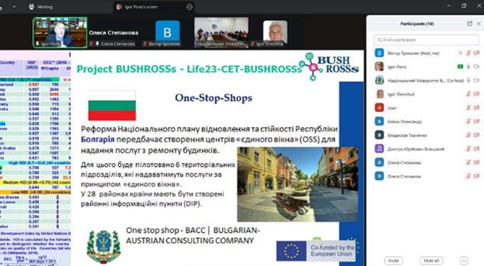 На секції №2 «Енергоощадні технології в енергетиці» команда у складі: Ivanka Pandelieva-Dimova (Sofia Energy Centre, Болгарія), Nina Nikolova (The Chamber of Installation Specialists in Bulgaria (CISB)),Victor Kaplun, Svitlana Makarevych, Olena Shelimanova, Ievgen Antypov (НУБіП України) представила доповідь «Results from research of local experience on the specific conditions and requirements for home renovation in Bulgaria and Ukraine». Були висвітлені результати аналізу локального досвіду, специфічних технічних, організаційних та законодавчих умов, що визначають процес реновації житлових будівель у двох країнах-партнерах. Представлені напрацювання є важливою частиною виконання завдань Проєкту LIFE-CET-BUSHROSSs та сприяють формуванню сучасних підходів до розвитку мережі «One – Stop – Shops» для підтримки глибинної реновації житла.