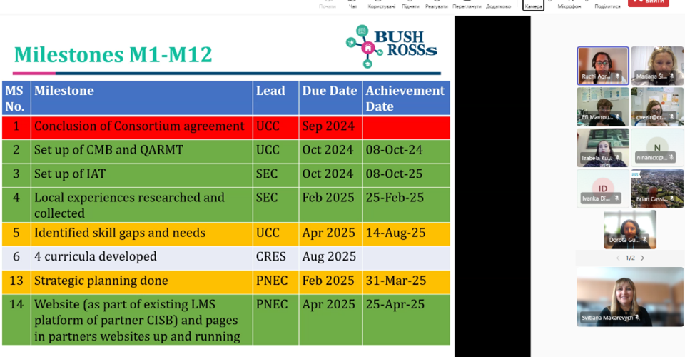 According to the Grant Agreement, the third online project meeting took place, with participation from the project coordinator Padraig Lyons and Ruchi Agrawal from the National University of Ireland, Cork, as well as representatives of partner organisations: Sdruzhenie Kamara Na Instalatorite V Bulgariya (Chamber of Installers in Bulgaria), Bulgaria — Ivanka Pandelieva-Dimova and Evelina Stoykova; Sofia Energy Centre (SEC), Bulgaria — Nina Nikolova; the Centre for Renewable Energy Sources and Savings (CRES), Greece — Georgia Veziryianni and Eftychia Mavrou; Stowarzyszenie Gmin Polska Sieć Energie Cites (PNEC), the Association of Municipalities “Polish Network of Energy Efficient Cities”, Poland — Anna Jaskuła; Gradbeni Inštitut ZRMK (GI ZRMK), Construction Institute, Slovenia — Marjana Šijanec Zavrl; and the Educational and Scientific Institute of Energy, Automation and Energy Saving of the National University of Life and Environmental Sciences of Ukraine — Viktor Kaplun, Svitlana Makarevych, Olena Shelimanova, Vitalii Savchenko, and Yevhen Antypov.