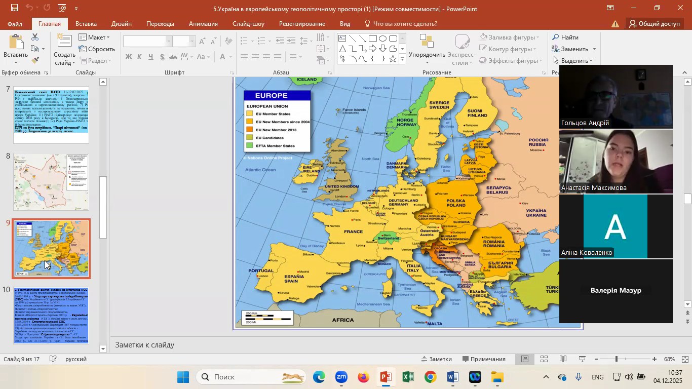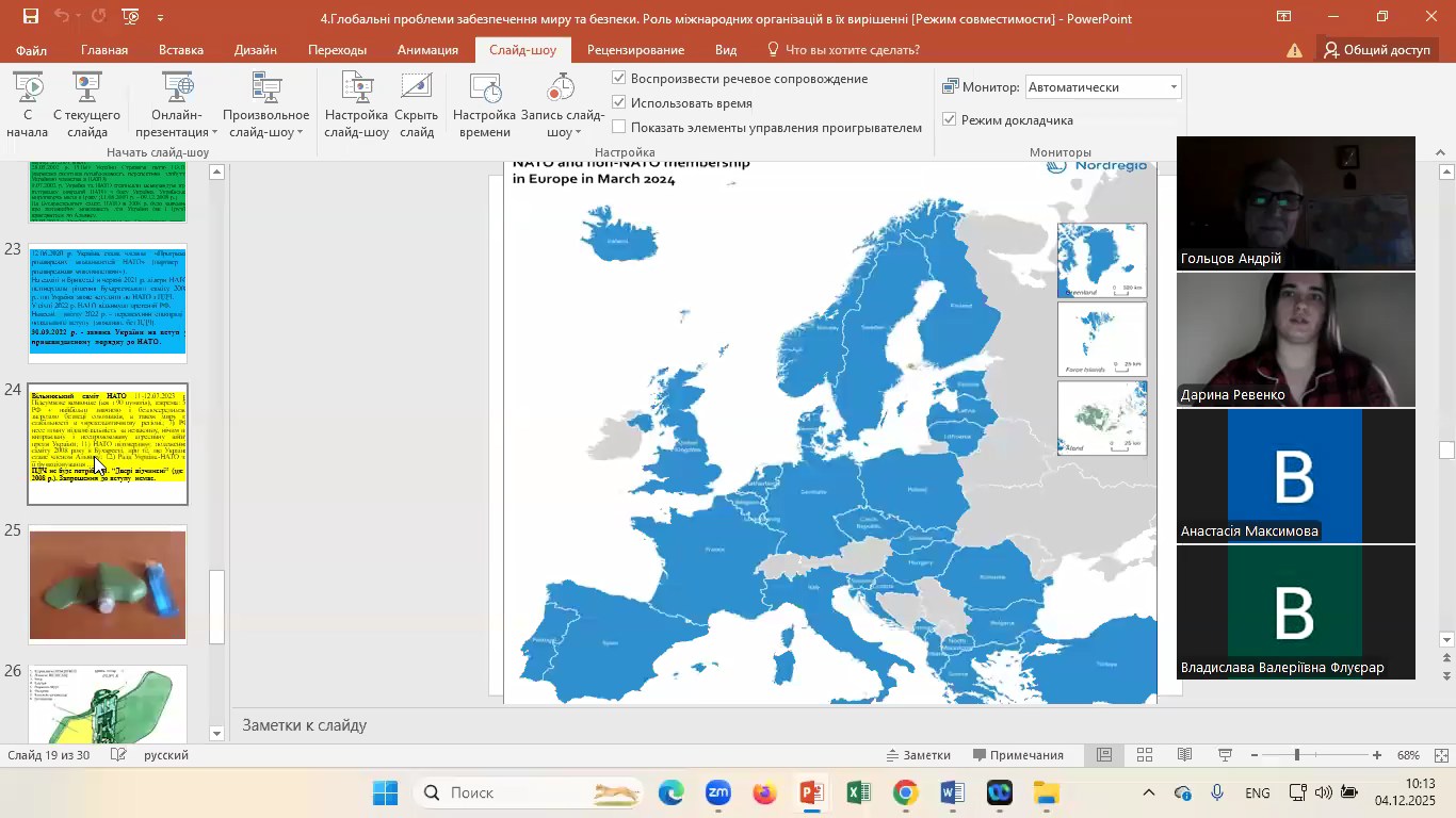 4 грудня 2025 року відбулося засідання студентського наукового гуртка «Актуальні проблеми міжнародних відносин» на тему «Сучасний розвиток НАТО, проблеми та перспективи вступу України до Альянсу. Утворення та розвиток Європейського Союзу». Як продовження тематики попереднього засідання, обговорювалися ще два питання. У своїх виступах Дарина РЕВЕНКО та Валерія МАЗУР розглянули основні етапи виникнення та розвитку відносин між Україною й НАТО. Крім позитивного досвіду взаємовідносин між Україною та Альянсом, було наголошено на низці проблемних моментів, наприклад під час президентства В. Януковича ці відносини фактично зазнали «заморожування». Після Революції гідності в 2014 р. відносини між Україною й НАТО суттєво активізувалися.