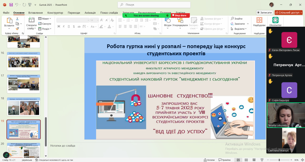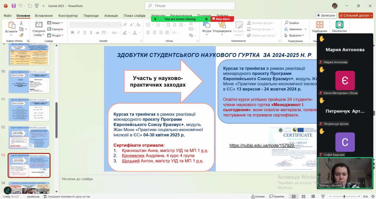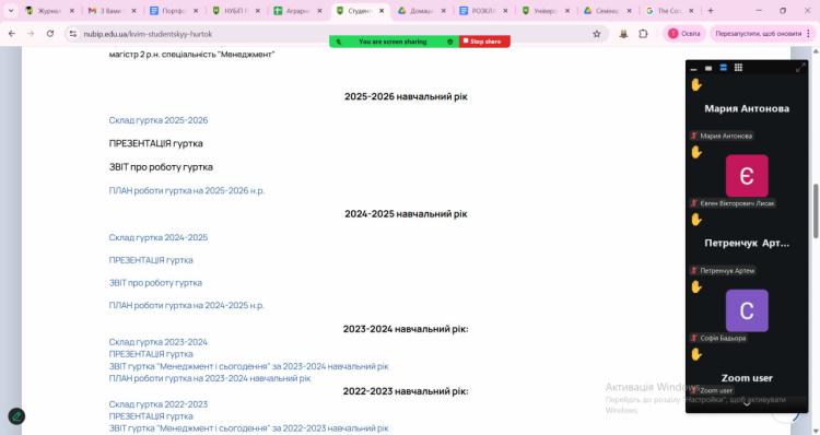 Окрему увагу приділено представленню сторінки гуртка на офіційному сайті університету, а також демонстрації презентації, у якій висвітлено ключові напрями роботи та здобутки гуртківців за попередній навчальний рік. Студенти дізналися про участь членів гуртка у наукових конференціях, круглих столах, конкурсах студентських наукових робіт та інших академічних ініціативах.