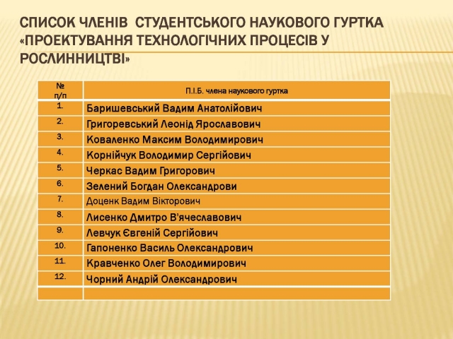 № п/п | П.І.Б члена наукового гуртка | Факультет інженерії агробіосистем, курс, група | |