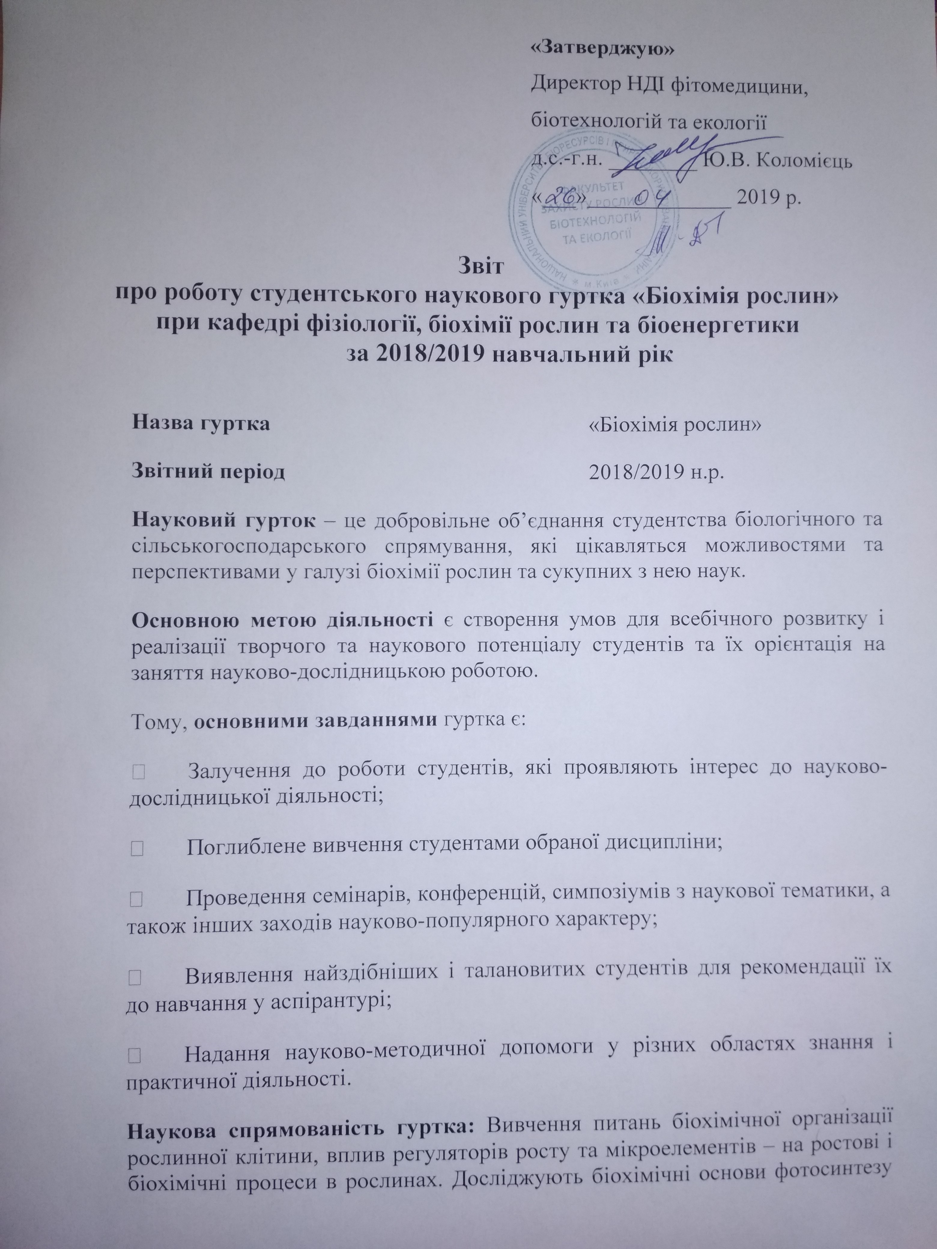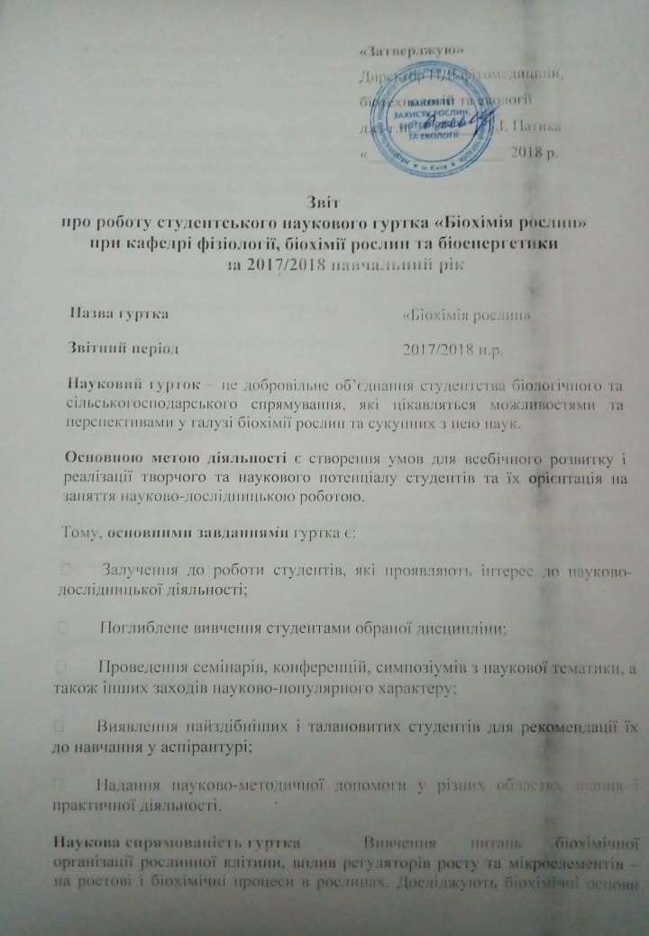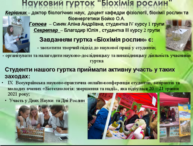 Науковий гурток з біохімії рослин – це добровільне об’єднання студентства біологічного та сільськогосподарського спрямування, які цікавляться можливостями та перспективами у галузі біохімії рослин та сукупних з нею наук.