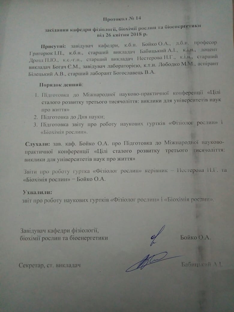30. | Дослідженняінтенсивності фотосинтезу полярографічним методом (за виходом розчинного кисню) та за утворенням крохмалю. | 05.05.22 | Cisco Webex Meetings | Бойко О. А. |