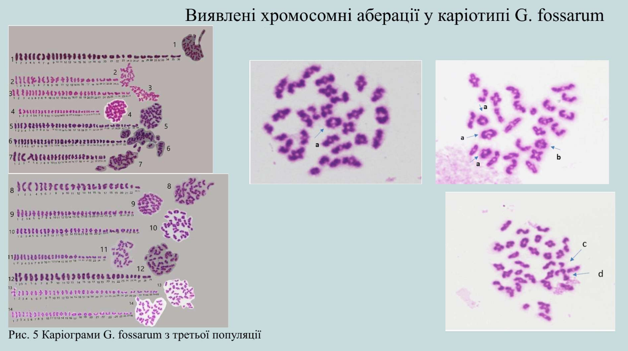 Результати досліджень виявили, що каріотип G. fossarum складається з 50 основних мета- та субметацентричних хромосом типу A та змінної кількості додаткових B-хромосом. Для C. ischnus характерний діапазон 2n = 60–70. Особливої уваги заслуговують виявлені хромосомні аберації (дицентричні хромосоми, кільцеві біваленти, фрагменти), пов’язані з природним забрудненням водойм кадмієм. Це демонструє мутагенний вплив важких металів на хромосомному рівні та підтверджує перспективність використання гамарид як біоіндикаторів.