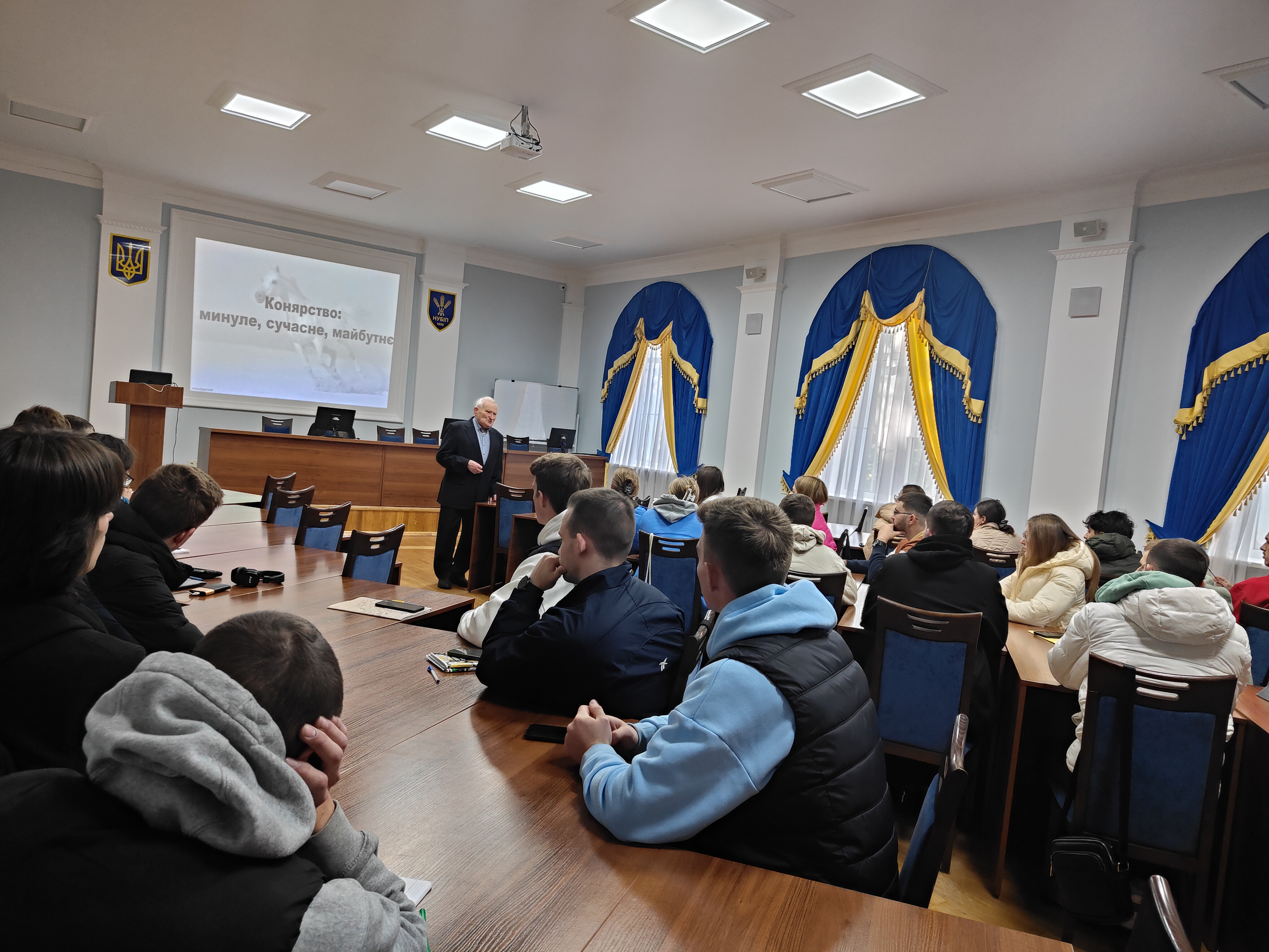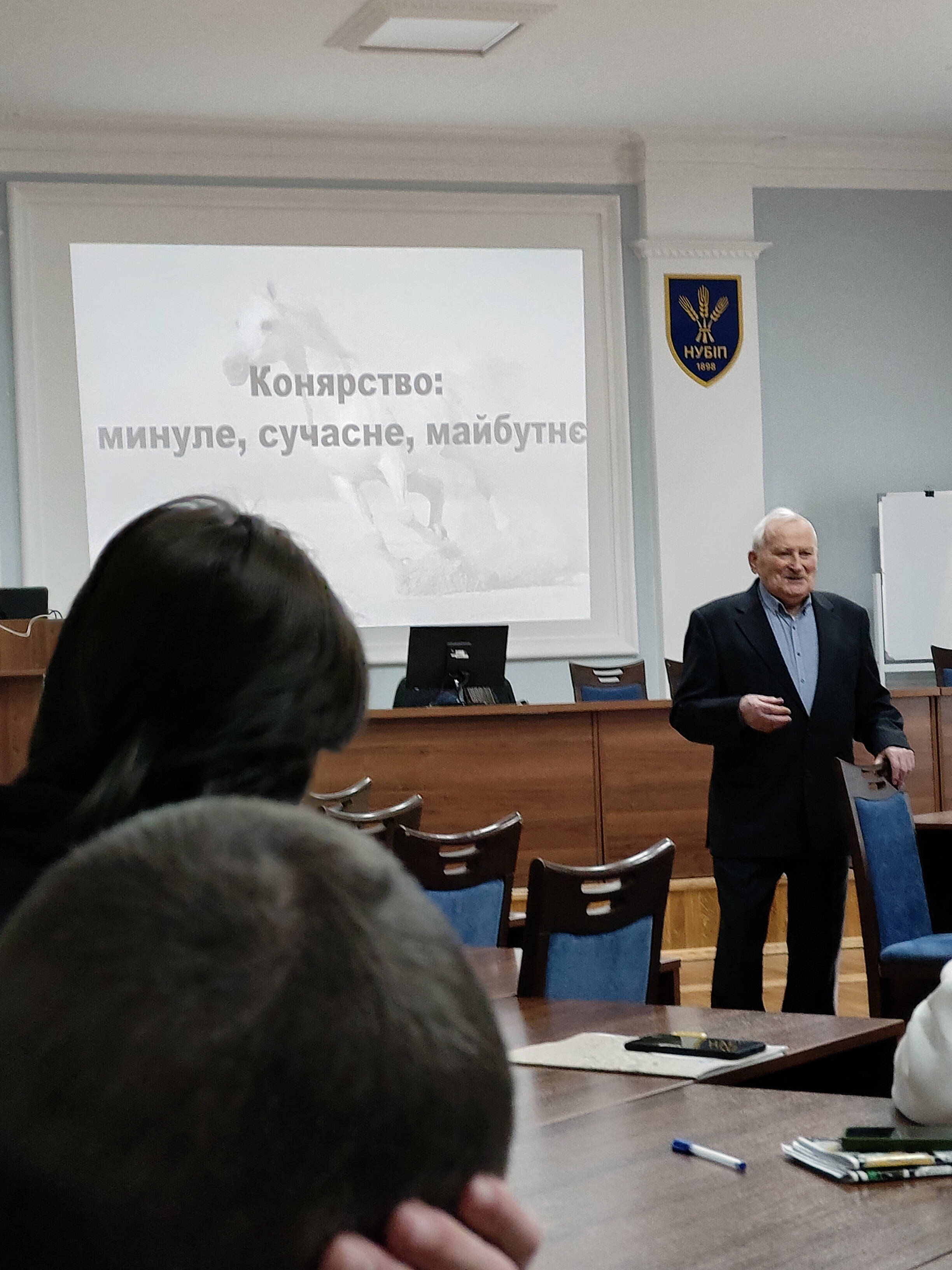 Не зважаючи на важке сьогодення, що також сильно зачепило галузь конярства, у рамках навчальної дисципліни «Конярство та кіннозаводство» для студентів 4 курсу та 3 курсу СТН ОС «Бакалавр» та студентів наукового гуртка "Спорт і нетрадиційне використання коней" факультету тваринництва та водних біоресурсів відбулася лекція запрошеного гостя, кандидата с.-г. наук, почесного професора НУБіП України, легенди українського конярства Гопки Бориса Максимовича на тему: «Стан галузі конярства в Україні».