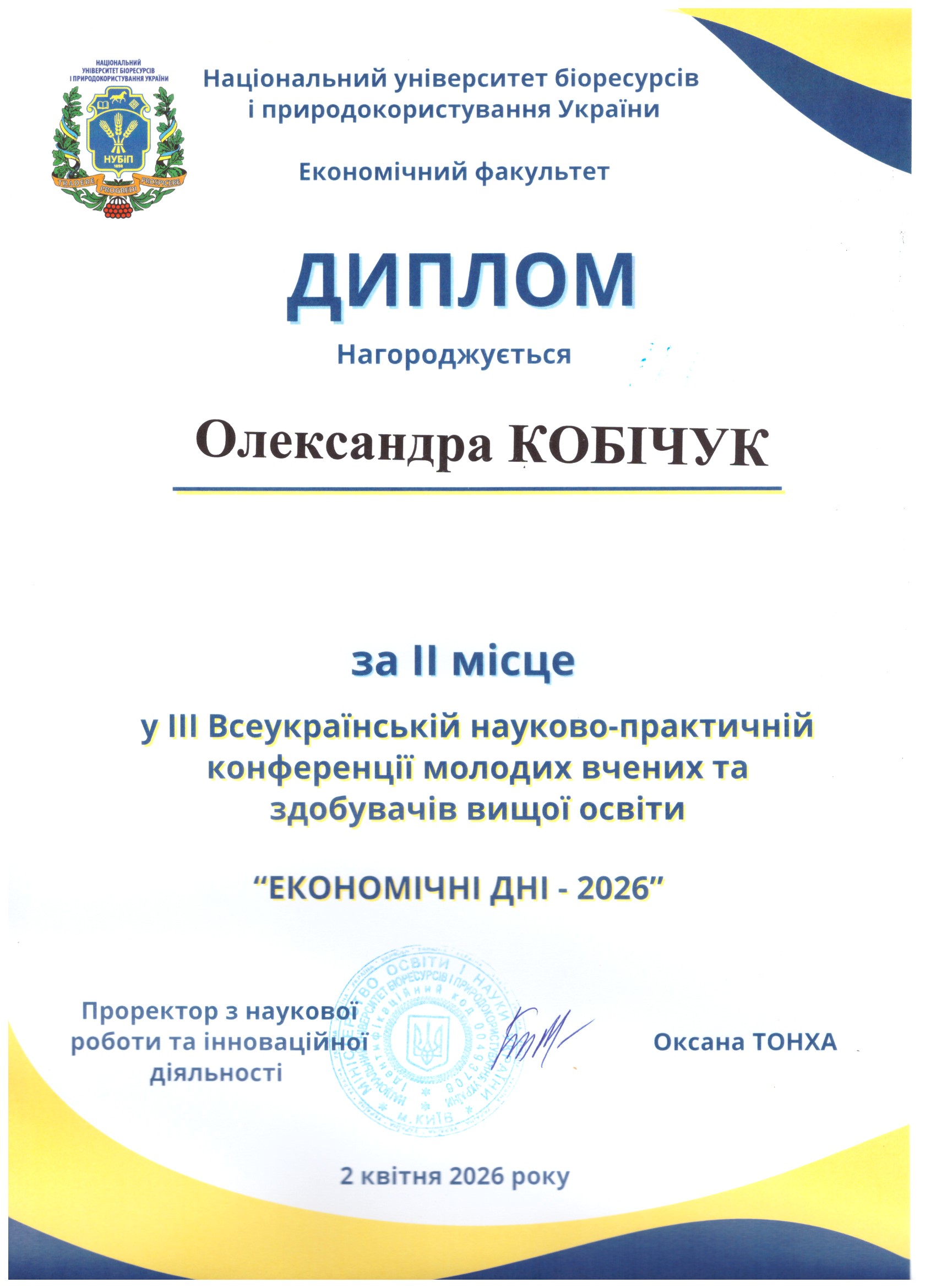 Олександра Кобічук - студентка 3 курсу спеціальності "Туризм і рекреація" - призер ІІІ Всеукраїнської науково-практичної конференції "ЕКОНОМІЧНІ ДНІ - 2026".