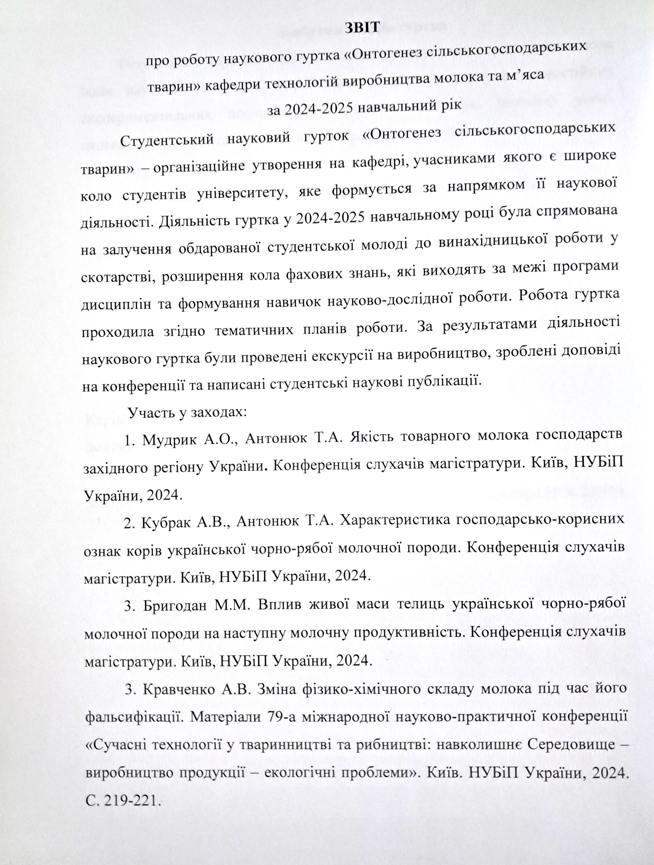 про роботу наукового гуртка «Онтогенез сільськогосподарських тварин» кафедри технологій виробництва молока та м’яса за