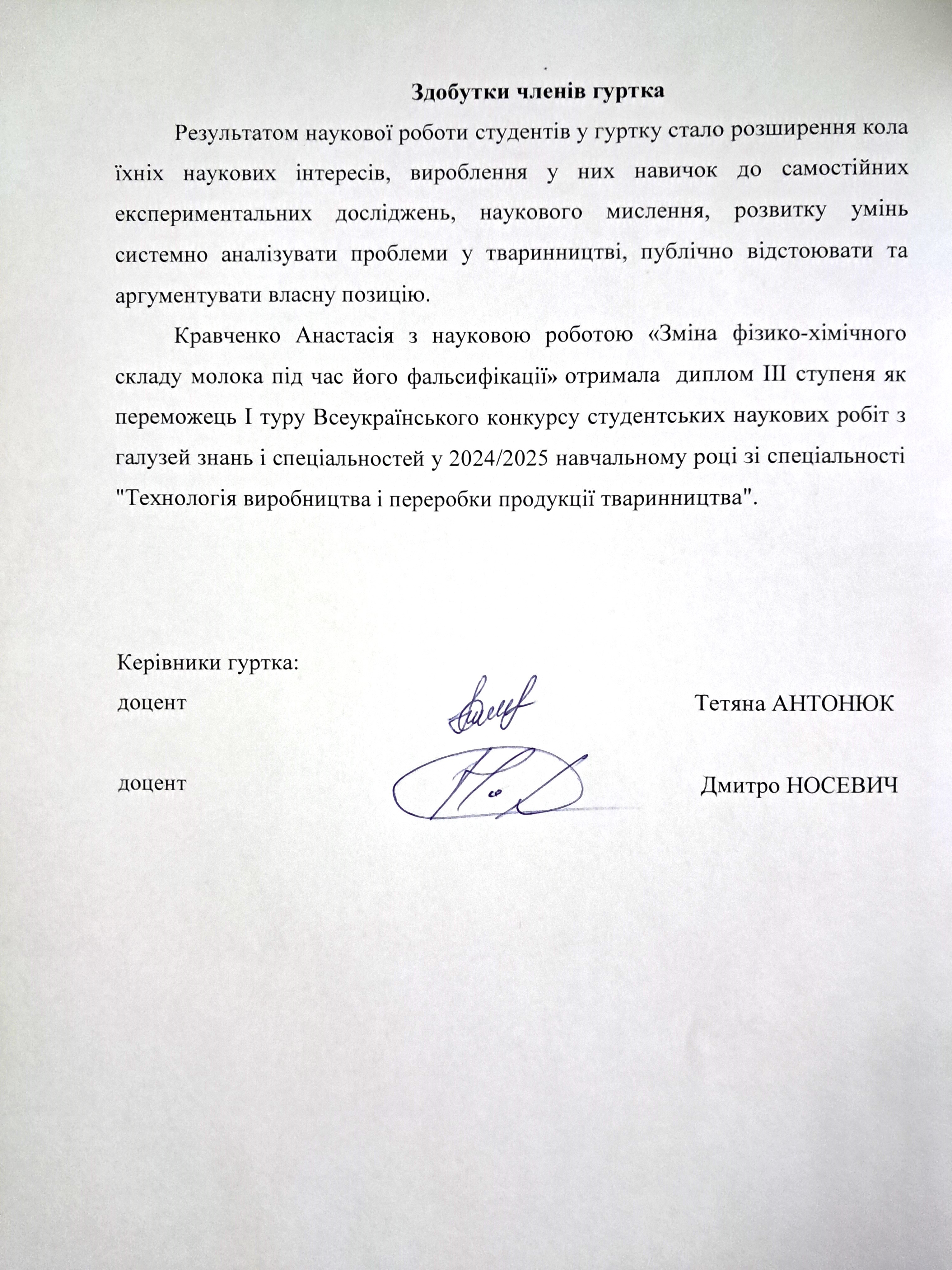 2. Талько А., Антонюк Т.А. Оцінка якості молока за температурою замерзання. Збірник тез доповідей ІІ науково-практичної конференції «Шляхи розвитку науки, освіти, суспільства в умовах сьогодення» 17 квітня 2024 р. – Немішаєве: ВСП НФК НУБіП України, 2024. – 316-320 с. (електронне видання).