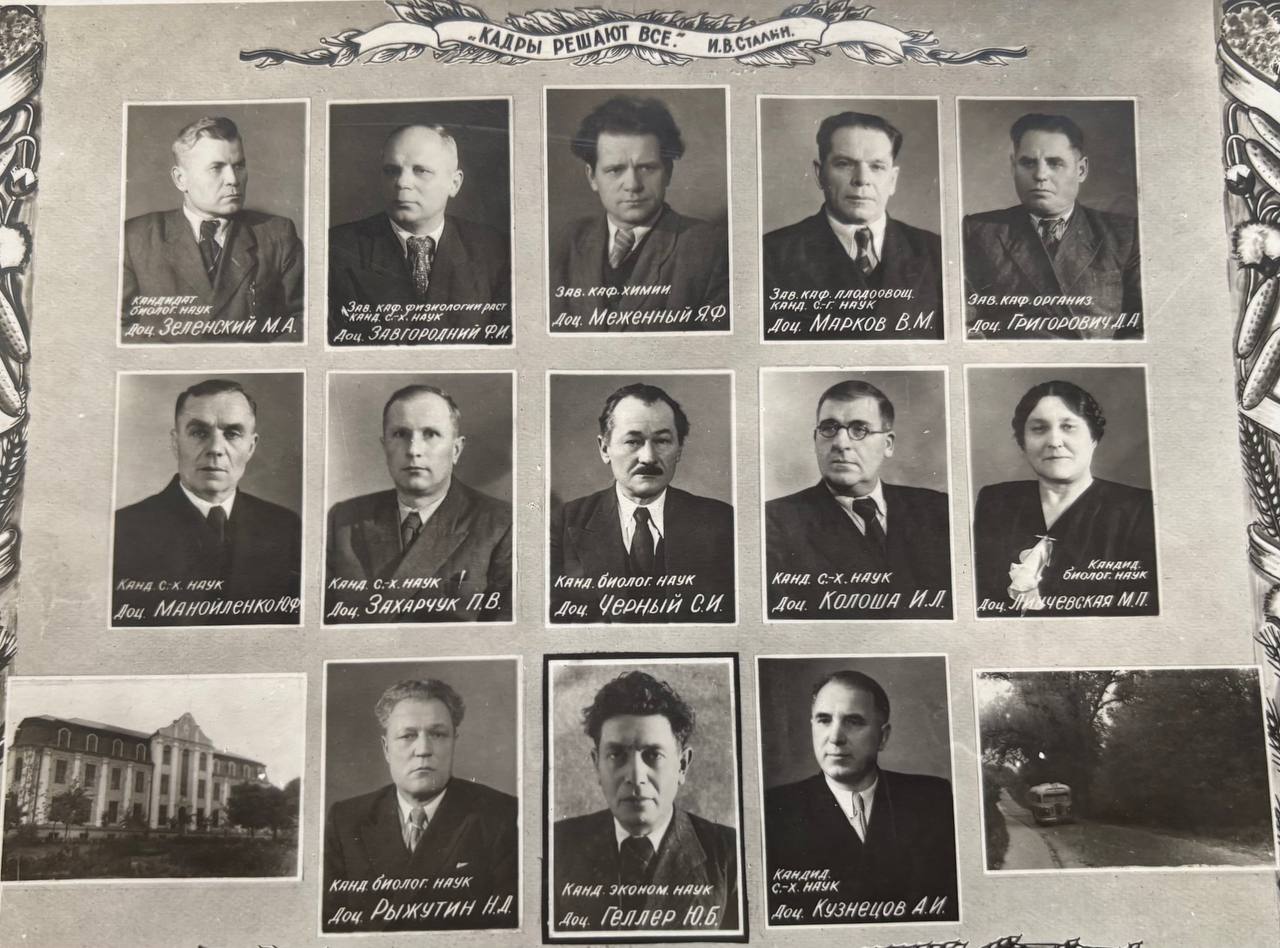 кандидат биолог. Наук доц. Зеленский М.А., зав. каф. физиологии раст. канд. с.-х. наук доц. Завгородний Ф.И., зав. каф. химии доц. Меженный Я. Ф., зав каф. плодоовощ. канд. с.-г. наук доц. Марков В. М., зав. каф. организ. доц. Григорович Д. А., канд. с.-х. наук доц. Манойленко Ю. Ф., канд. с.-х. наук доц. Захарчук П.В., канд. биолог. наук доц. Черный С. И., канд. с.-х. наук доц. Колоша И. Л., кандид. биолог. наук доц. Линчевская М. П., канд. биолог. наук доц. Рыжутин Н. Д., канд. эконом. наук доц. Геллер Ю. Б.; кандид. с.-х. наук доц. Кузнецов А. И.;