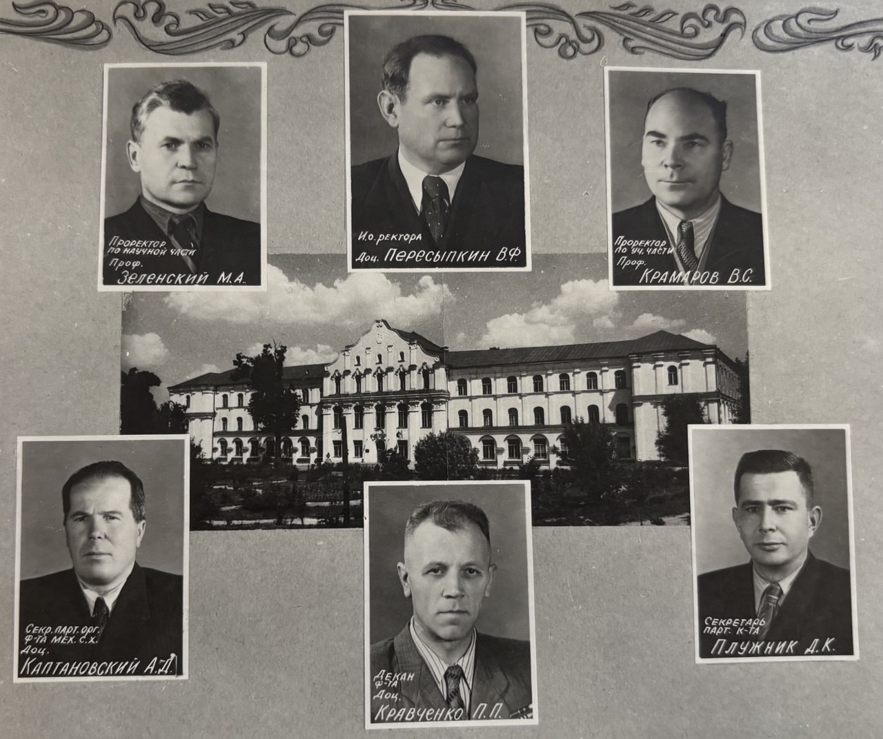 (мова оригіналу: проректор по научной части проф. Зеленский М.А., и.о. ректора доц. Пересыпкин В.Ф., проректор по уч. части проф. Крамаров В.С., секр. парт. орг. ф-та мех. с. х. доц. Каптановский А.Д., декан ф-та доц. Кравченко П.П., секретарь парт. к-та Плужник Д.К.)