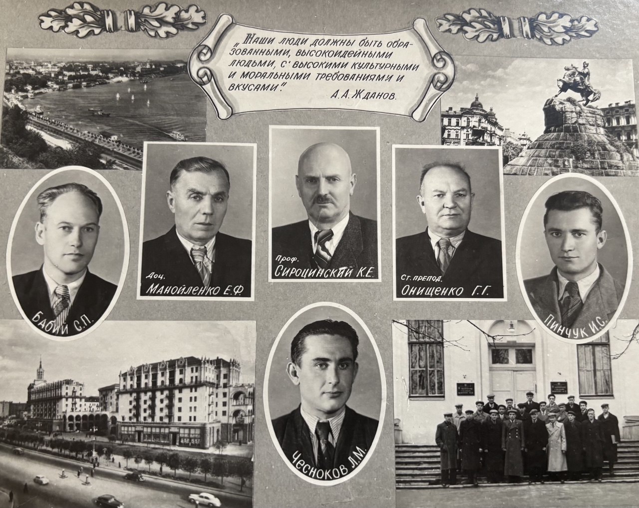 нач. каф., ген.-майор Шакін І. С., заст. директора з наук. частини Гусєв В. І., директор ін-ту Шитов І. М., декан л.-м. ф-ту Гурмаза А. М., полковник Каргавенко А. М., директор НДІП, лауреат Сталінської премії, канд. с.-г. наук Дука С. Х., секретар партбюро Кальной П. Г., заст. директора з АГЧ Мироненко В. І., зав. каф., проф. Бодров В. А., доц. Миловидов А. М., доц. Полубояринов І. Й., ст. викл. Погорєлова Л. В., зав. каф. Адамов І. Г., доц. Кубишкін П. П., асист. Падій Н. М., ст. викл. Сазонов І. М.