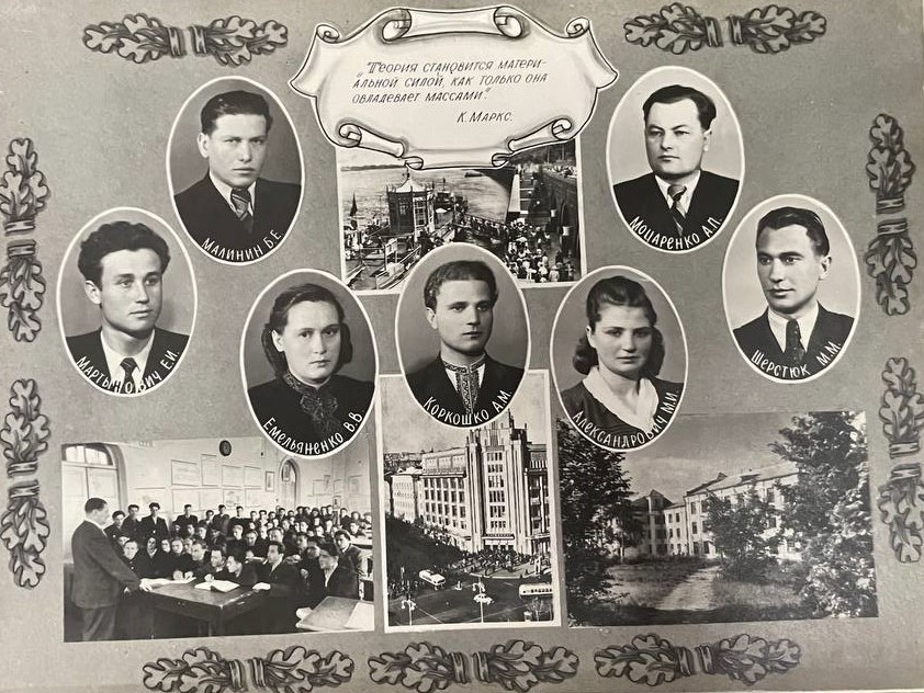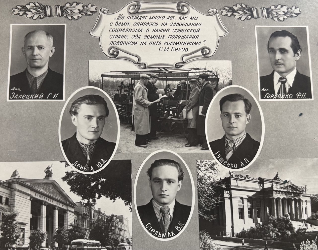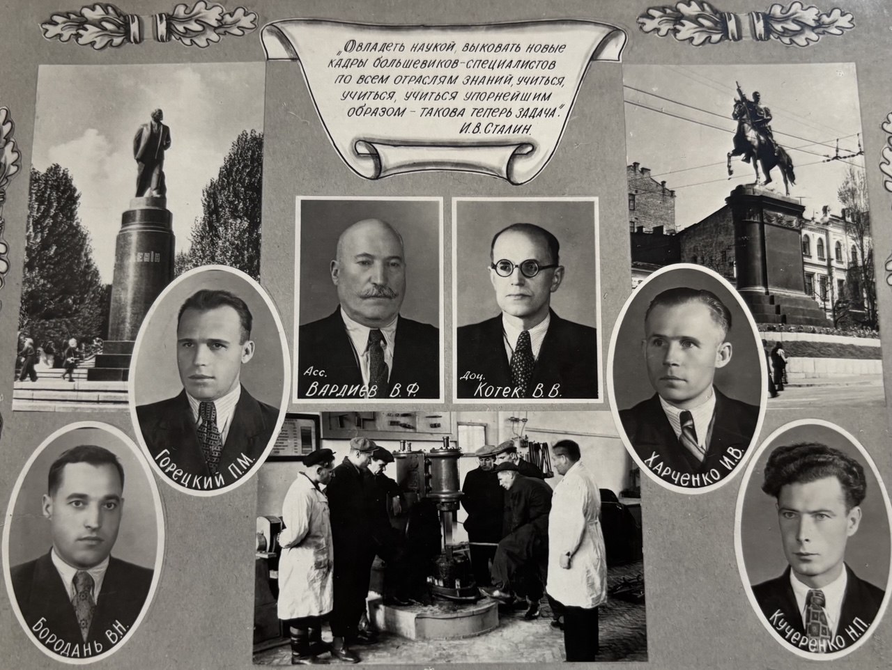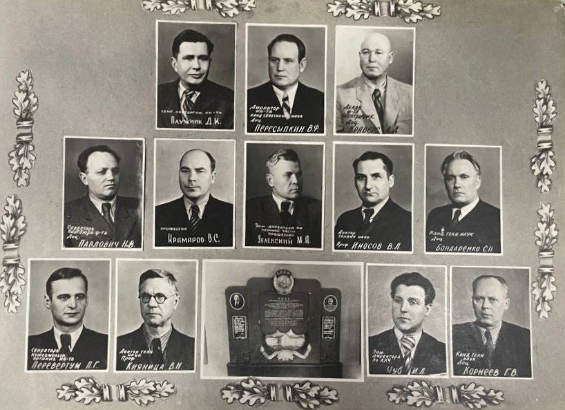 (мова оригіналу: проф. Чеботарев Р.С., акад. Касьяненко В.Г., зам. дире. ин-та по уч. части, проф. Безносенко А.Ю., дир. ин-та, проф. Лемишко П.М., секр. парт. орган. ин-та Василенко Д.Я., декан ин-та, доц. Борисевич В.И., проф. Чубарь В.К., проф. Вашетко Н.П., ген.-майор Полищук А.П., доц. Аветисьян А.А., зав. каф. марк.-лен., канд. ист. н. Гуменюк П.П., заслуж. деятель науки, проф. Поваженко И.Е., проф. Кравченко Н.А., проф. Скороходько А.К., доц. Нагорный И.С., доц. Баженов С.В., проф. Полянский М.А., член-кор АН, луреат Сталинской премии, проф. Гулый М.Ф., проф. Понамаренко М.Ф., проф. Слабоспицкий Т.П., доц. Дмитриев К.И., доц. Братюха С.И., доц. Настенко К.А., доц. Гиммельрейх Г.А., доц. Волкобой М.Ф., канд. н. Радчук Б.В.)