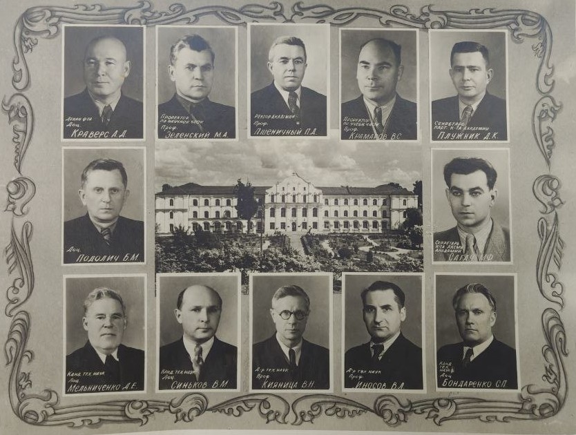 (Мова оригіналу: Секретарь к-та ЛКСМУ академии Сагач М.Ф., проректор по научной части проф. Зеленский М.А., ректор академии проф. Пшеничный П.Д., проректор по учеб. части проф. Крамаров В.С., секретарь парт. к-та академии Плужник Д.К., декан ф-та доц. Кравченко П.П., секр. парт. орг. ф-та мех. с.х. доц. Каптановский А.Д., доц. Бенедикт Н.Н., Соловей Н.Ф., доц. Головинский Л.К., асс. Венгеровский Н.Е., Руденко А.И., Панасюк Ю.Т., Пличко К.М., Котов Д.Е., Буренок В.А., Мамон В.Н., препод. Славянцев, ст. препод. Олейник В.С., Закутинский Л.Л., Мушенко А.З., Руденко В.Г., Гальчун П.П., Фещенко В.К., доц. Королев П.Г., Заможный И.Ф., Лукашевский В.П., доц. Павлович Н.В., Игнатенко В.П., Карманов Н.Д., Павленко В.П., Шупин Е.В., Войцицкий В.К., Васильченко А.И., и.о. ректора доц. Пересыпкин В.Ф., Антонишин Р.З., Онищук С.Т., Синегуб С.И., Потапенко А.Т., доц. Манойленко Е.Ф., Атамась М.А., Дулов И.А., ст. преп. Ведмидь Н.П., Игнатьков Т.И., Жердий Н.А., Коваль М.И., Майборода Н.И., Цымбал А.Г., Нечипоренко И.Т., Иваницкий В.Л., ст. преп. Блиндеров В.Ф., Венжик С.И., Майборода М.А., Полевой А.К., Лазоренко В.И., Федоренко А.З., доц. Бублик С.П., проф. Василенко П., Костына В.Т., Витер С.Ф., Афтынюк И.С., Бурков Г.К., Редько И.С., зав. каф. доц. Костин Б.Д., доц. Розов С.В., Джура В.Ф., Насальский Д.А., Любонько В.П., Голушко П.Е., Пономарев К.И., Хвостик В.В., доц. Могильный И.П., Абарбарчук И.М., Шестопал В.А., Ямненко Г., Олефиренко Г.А., Мазан В.Е., Медведев А.А., Будкин Н.Н., Белоус Ю.Е., Глусский Е.В., доц. Шапиро Л.М., Гайша А.Ф., Белоус М.С., Ахтырский П.Е., Тарнаруцкий В.И., доц. Бондаровский Ф.П., доц. Зеленский Г.И., Малярчук А.И., Онуфриенко Ю.Ф., Островский М.И., Ревук А.Р., Деревянко А.И., Пастушенко В.П., доц. Киртбая Ю.К., доц. Натанзон И.И., Полывяный В.Л., Герасимчук В.Г., Погорелов Б.М., Литовко В.П., Личачеко А.М., Литвин В.Ф., асс. Вардиев В.Ф., доц. Котек В.В., Кунтыш В.П., Цыглим С.И., Чапля И.М., Семенов Ю.И., Сочивкин И.И., ст. преп. Лаврентьев М.В., Опалко В.М., Притченко И.В., доц. Зарайский С.К., Воронов Н.И., Метельский В.В., Плисюк П.Г., Ермоленко И.Ф., Недашковский Ф.К., доц. Кузьминский В.Т., асс. Гордейко Ф.П., Украинец Н.С., Хоменко М.С., Ровинский И.П., Артюшенко В.В., Семенченко П.Г., Коберниченко И.А., ст. преп. доц. Краверс А.Д., Матушинский В.Е., Карпенко Г.И., Развевако А.А., Самсоненко Н.С., Куптий А.П.)