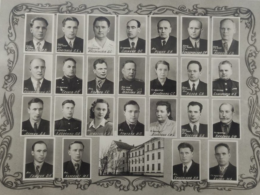(мова оригіналу: ас. Вертечная Г.И., ст. викл. Макарин М.Н., ст. викл. Майорщик Л.И., доц. Поспехов Д.А., доц. Басин-Щулак И.Я., доц. Салганский А.А., викл. Несин П.Ф., ас. Эдлин Л.А., ас. Кисилевский Р.Г., викл. Добротворский С.И., ас. Кохненко М.А., ас. Красильник М.Г., ас. Кавецкая Г.А., ас. Агарков, ас. Шевелев В.М., ас. Мушкетик Л.М., викл. Сивай В.Н., ас. Залевский А.Н., викл., підполковник Чечиль Д.Я., викл., підполковник Пантюхин И.И., викл. Беляев И.Г., ст. викл. Хоменко М.Е., ас. Матвеев Н.С., ас. Нашиванко М.С., ас. Гегельский И.Н.).