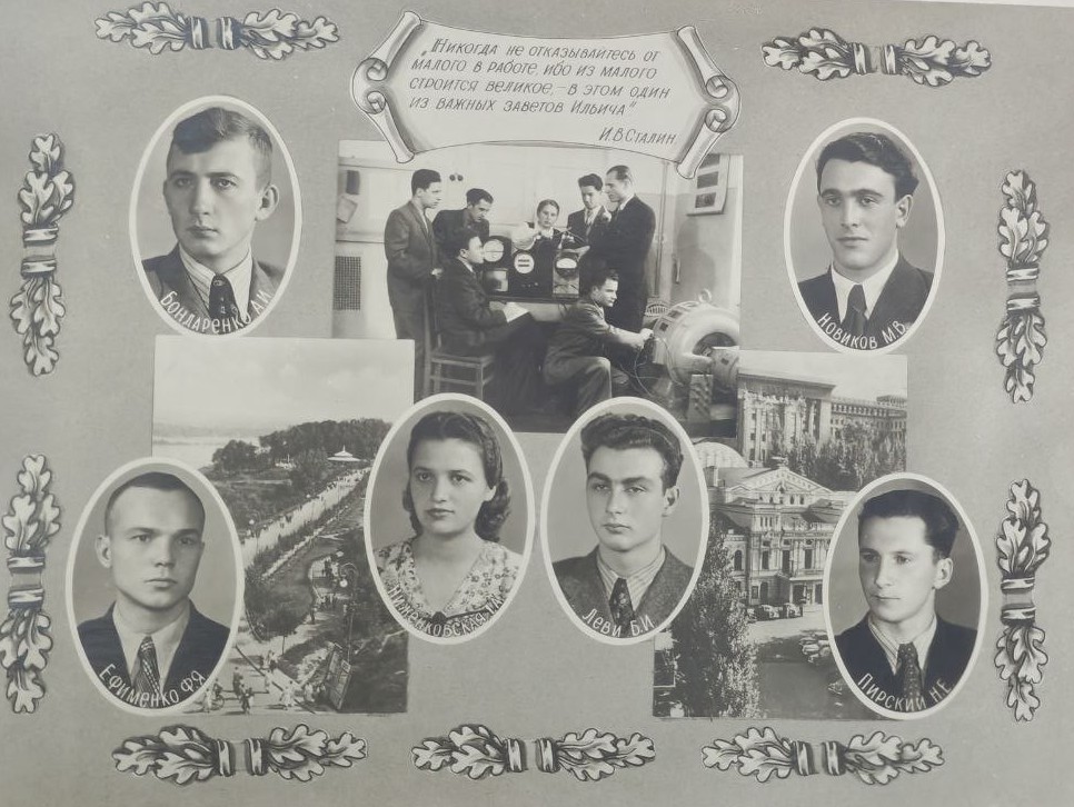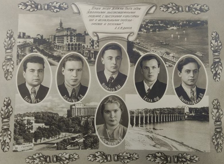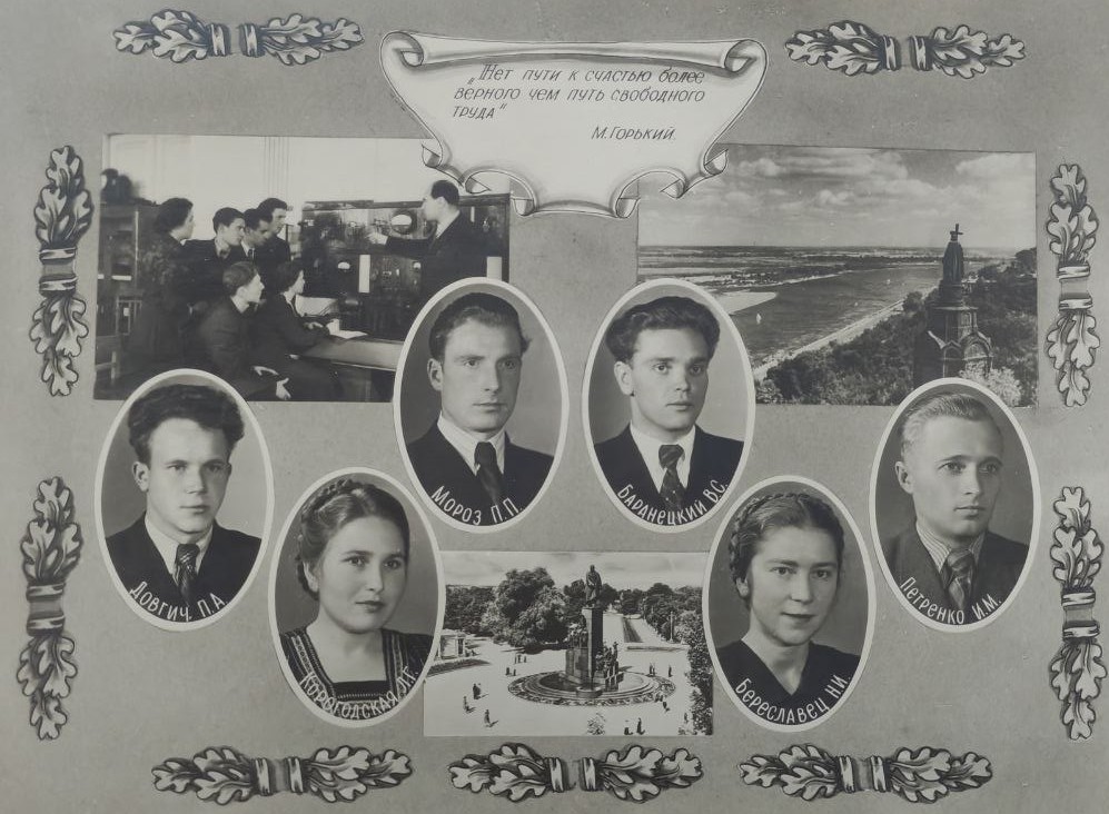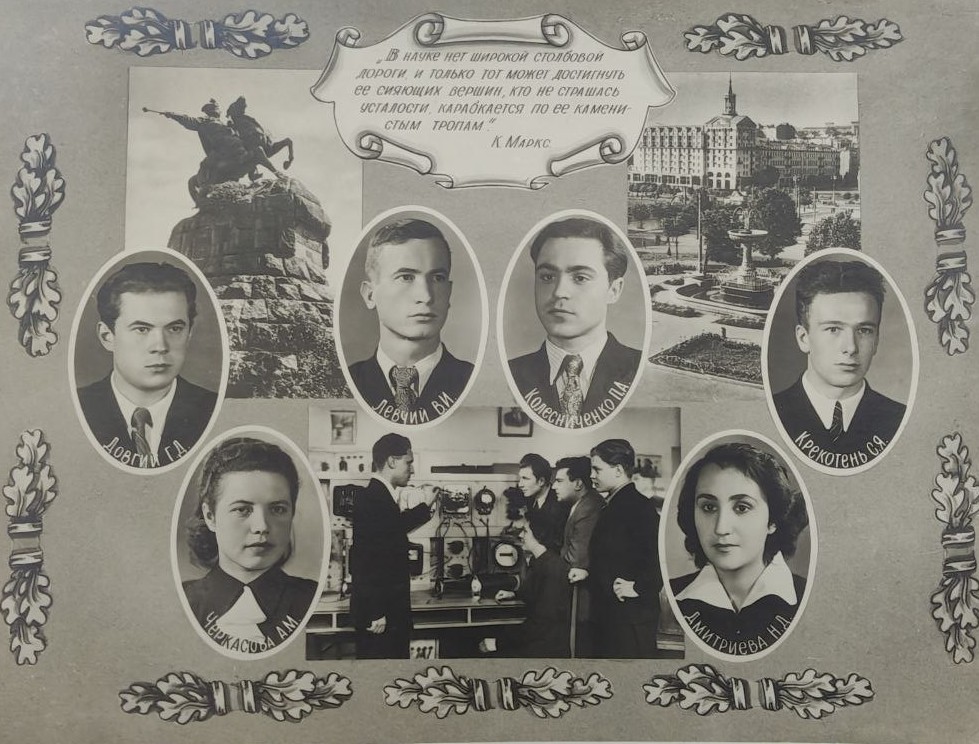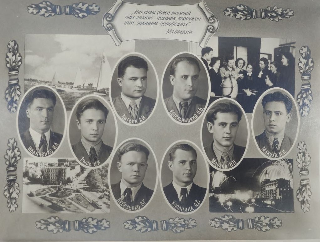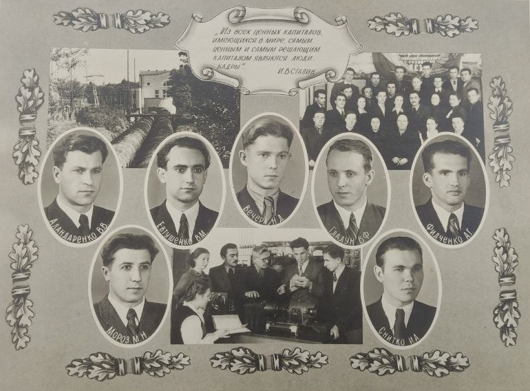 (мова оригіналу: декан ф-та доц. Краверс А.Д., проректор по научной части проф. Зеленский М.А., ректор академии проф. Пшеничный П.Д., проректор по учебн. части проф. Крамаров В.С., секретарь парт. к-та академии Плужник Д.К., доц. Подолич Б.М., секретарь к-та ЛКСМУ академии Сагач М.Ф., канд. тех. наук доц. Мельниченко Д.Е., канд. тех. наук доц. Синьков В.М., д-р тех. наук проф. Кияница В.Н., д-р тех. наук проф. Иносов В.Л., канд. тех. наук доц. Бондаренко С.П.)