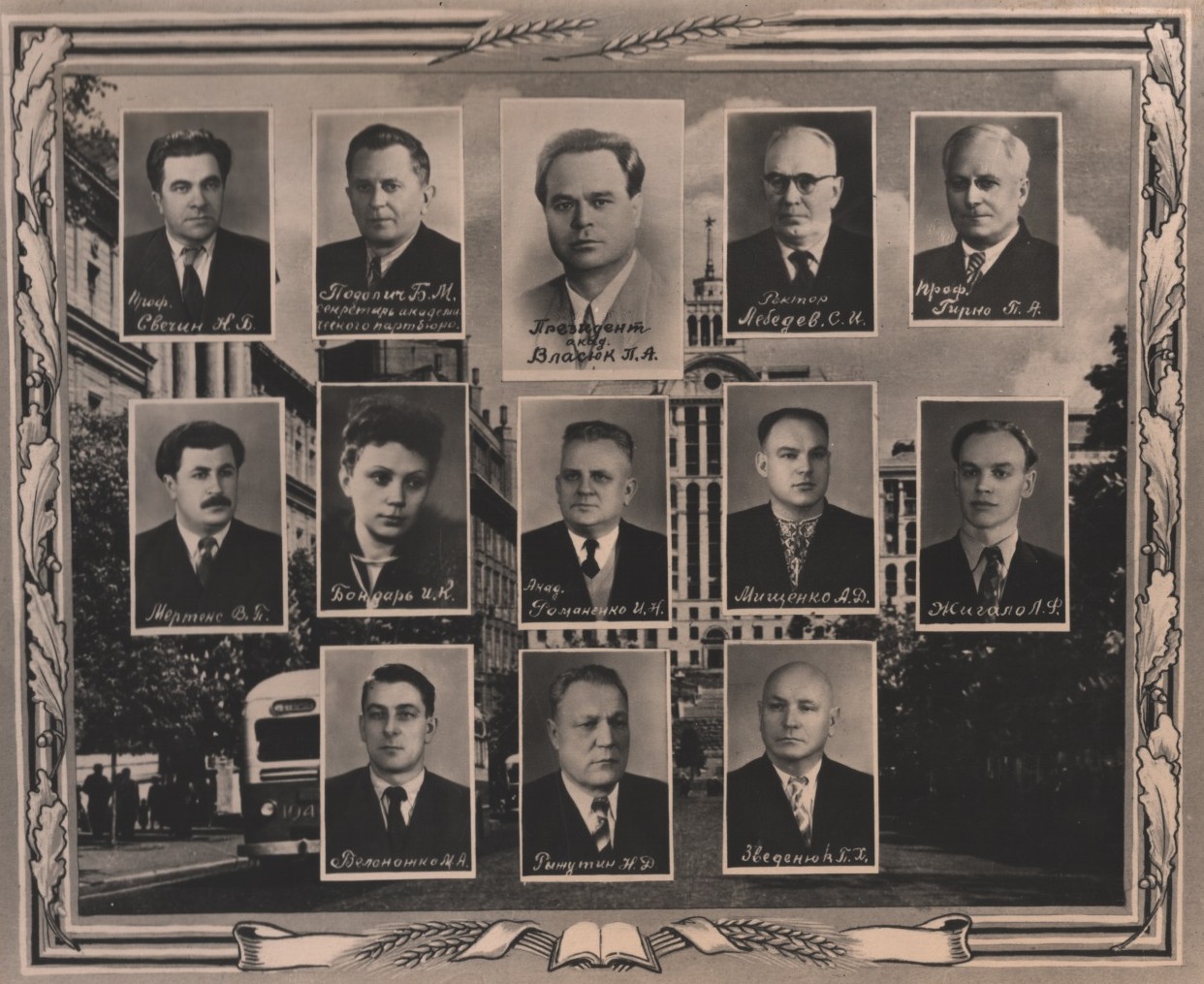 (мова оригіналу: проф. Свечин Н.Б., секретарь академии Подолич Б.М., Президент академии Власюк П.А., ректор Лебедев С.И., проф. Гирко П.А., Мертенс В.П., Бондарь И.К., акад. Романенко И.Н., Мищенко А.Д., Жигало Л.Ф., Белоножко М.А., Рыжутин Н.Д., Зведенюк П.Х. )